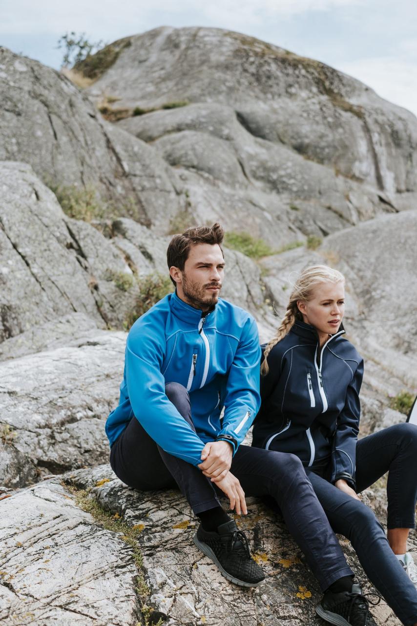 Fin og praktisk unisex softshelljakke. Elastisk regulering i linning og borrelås på ermer. Stikklommer i front, brystlomme og lomme på ermer med glidelås.