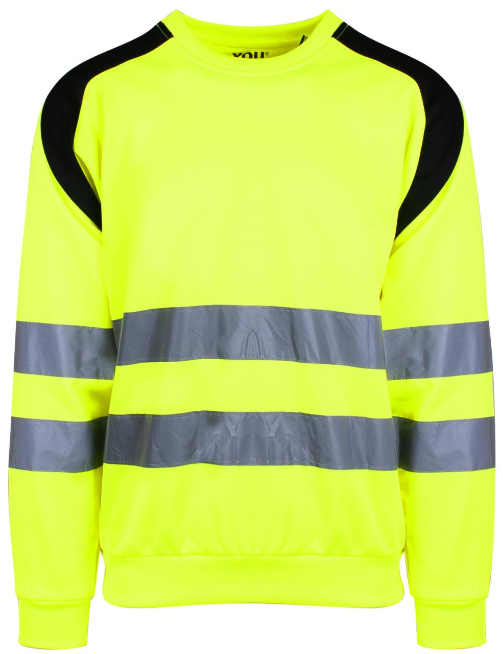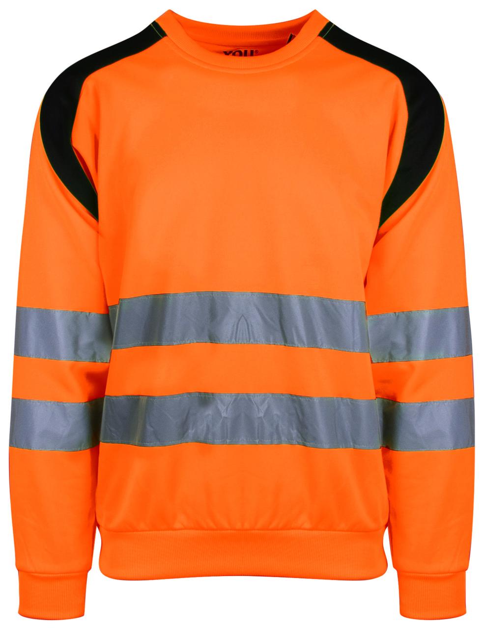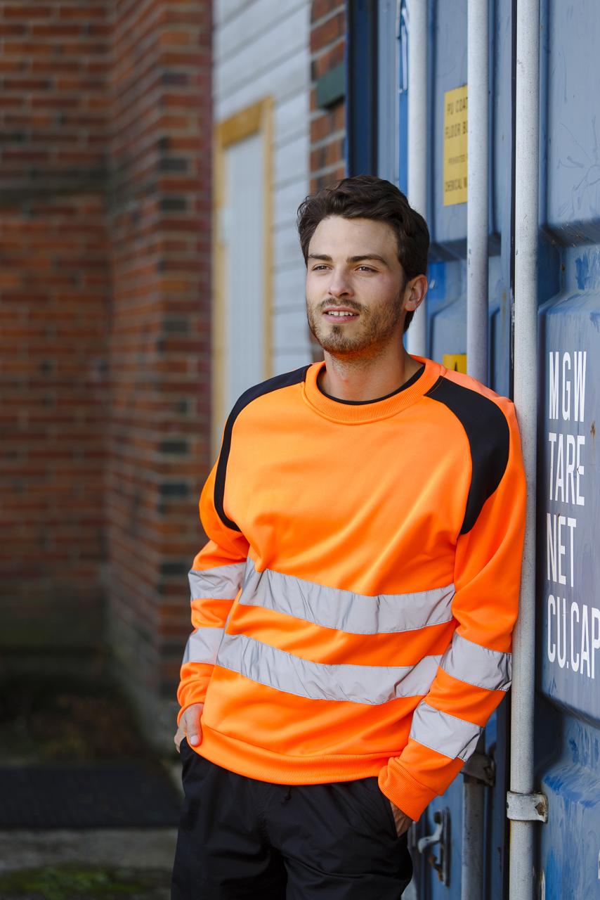 Unisex sweatshirt i fluoriserende farger med påsydde reflekser som sørger for at du er godt synlig i omgivelsene. 2- lags rib med lycra i alle ribber. Flosset innside. CE- merket. EN 20471, klasse 2.