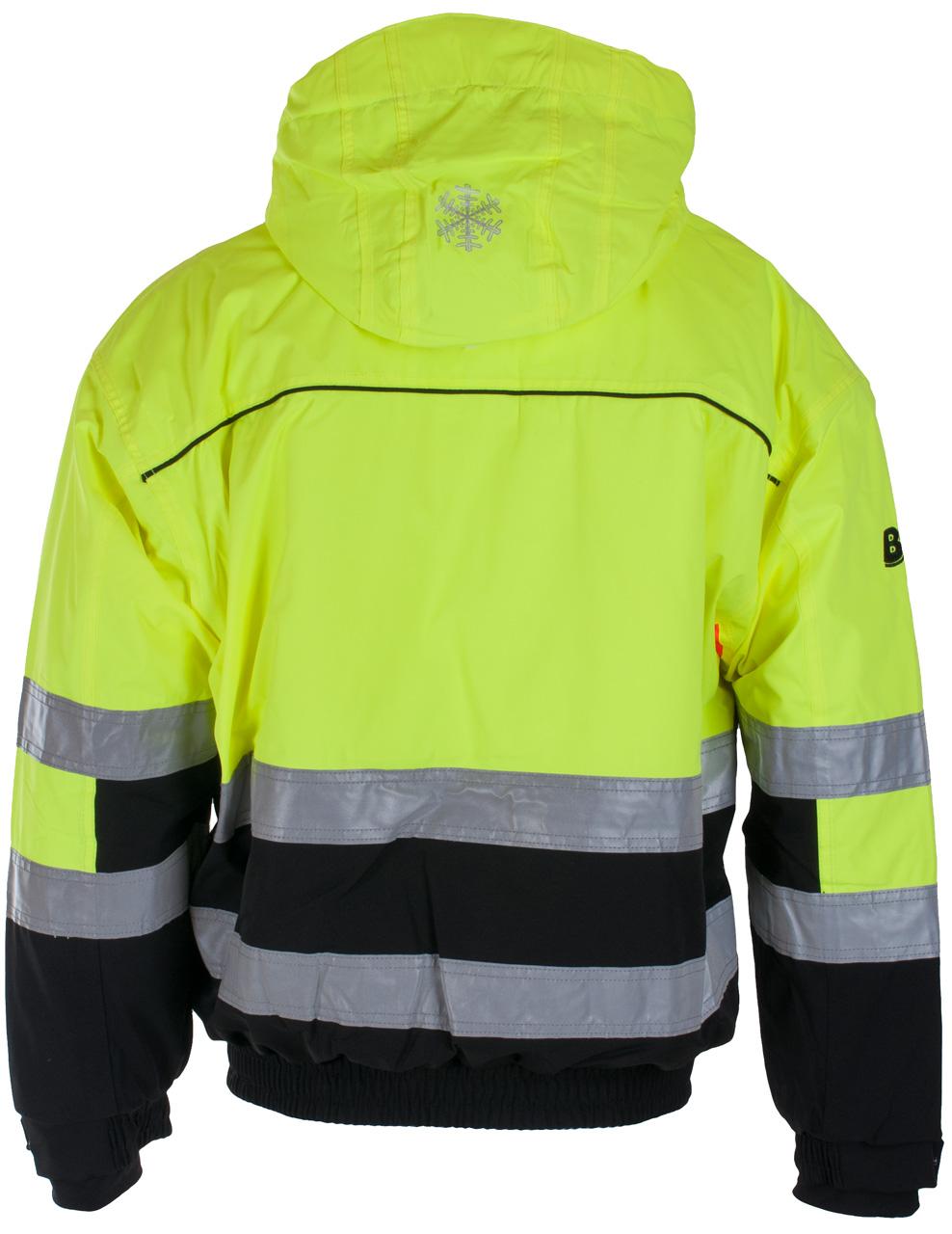 Vattert pilotjakke med avtagbar hette. Kraftig fôr. Borrelåsstramming rundt håndledd og glidelås med klaff i front. Vanntett 8000 mm, pustende 5000 mvp. EN ISO 20471 klasse 2.