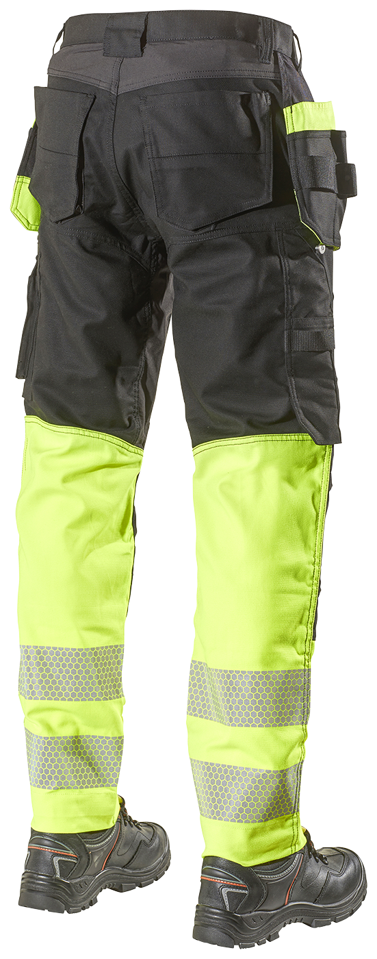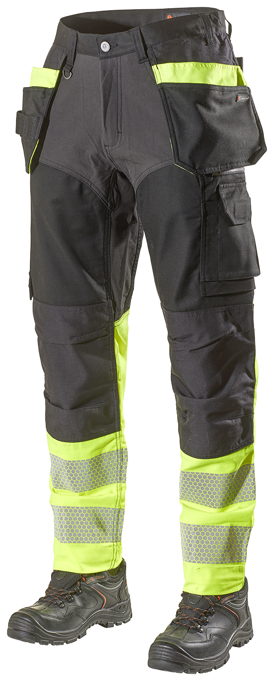 Smidig Hi-Vis-sertifisert arbeidsbukse i klasse 1, med god slitestyrke i hovedmaterialet. Flere fireveisstretchpaneler for bedre bevegelsesfrihet og komfort. Buksen er utviklet i nært samarbeid med brukere, og den har flere funksjonelle lommer, slik at du får de beste forutsetningene for arbeidsdagen.