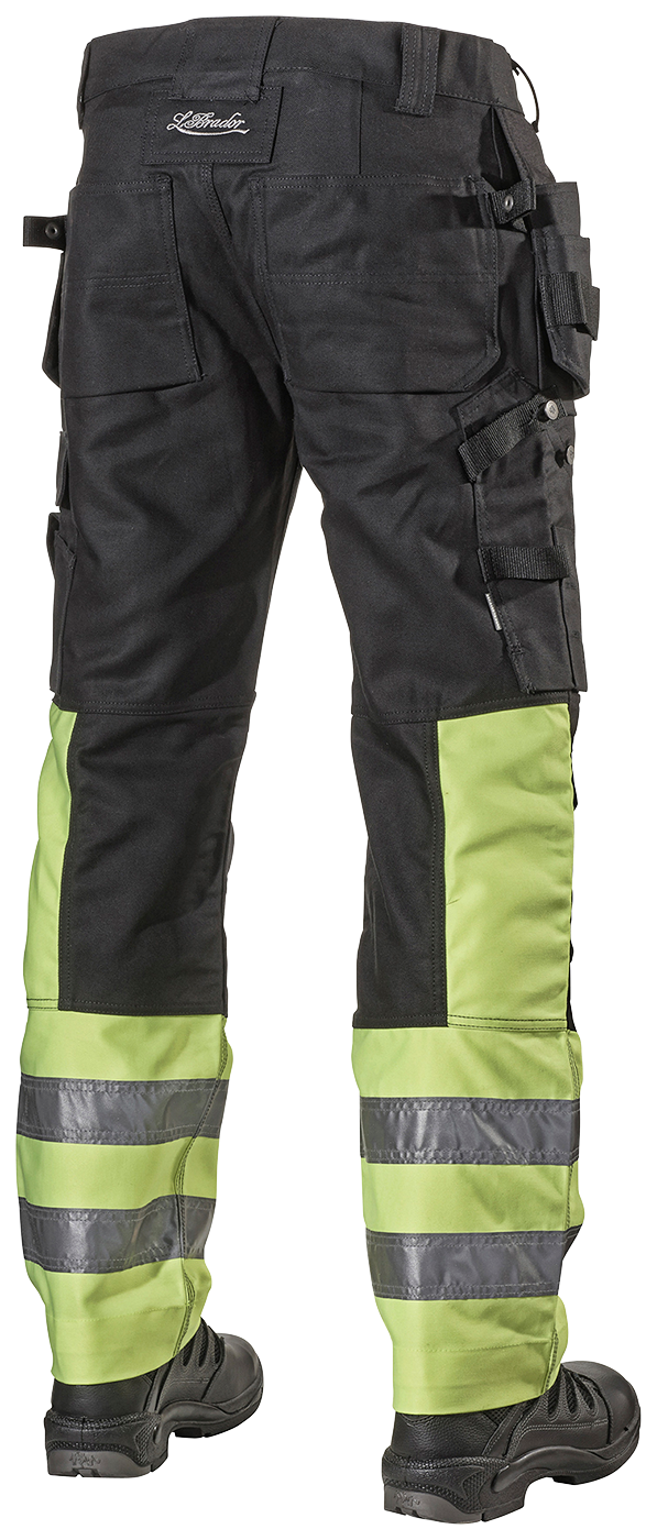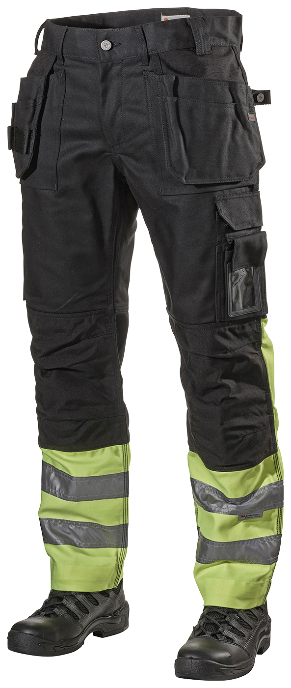 To hengelommer, to frontlommer og to baklommer. Innvendige lommer til knebeskyttere i to høydenivåer. Knivholder, beinlomme med klaff, tommestokklomme, lomme til penn, telefonlomme, to hammerholdere og ID-kortlomme.