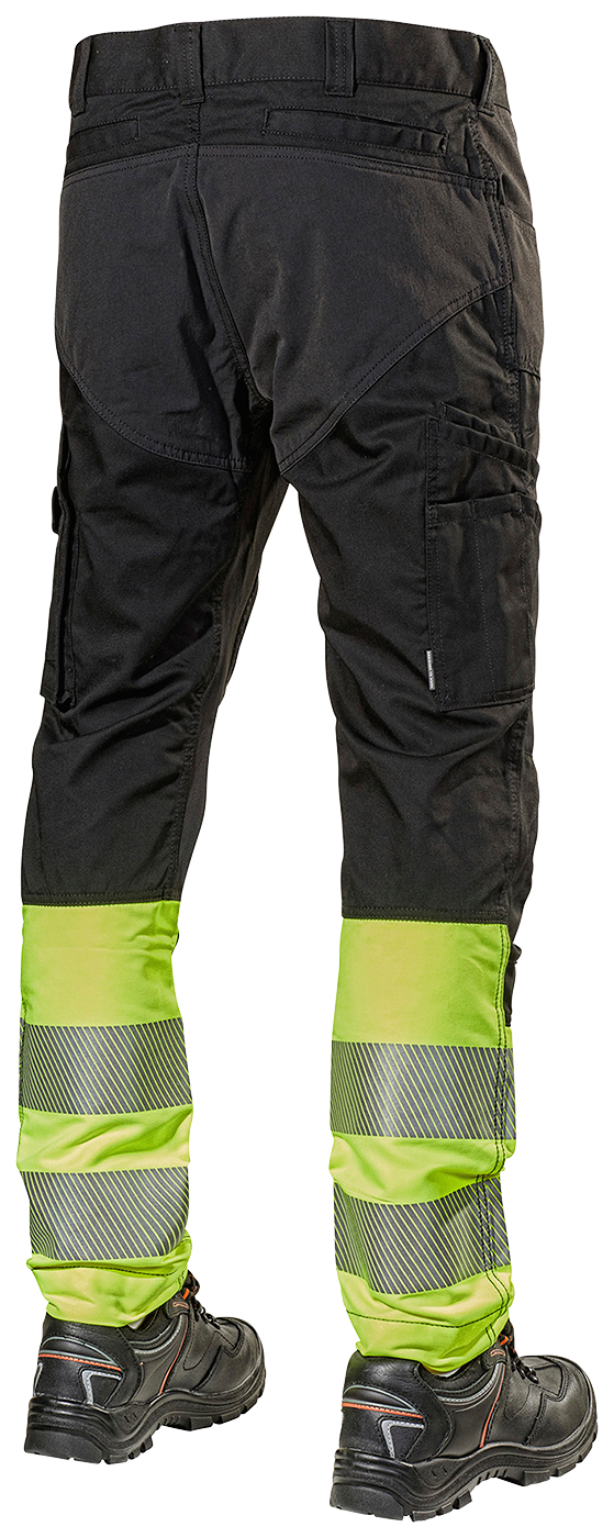 Bukse med to framlommer, innfelt stolpelomme og to benlommer. Høyre benlomme har tommestokklomme, notatblokklomme og blyantlomme. Vensre benlomme har glidelås og utvendig vinklet telefonlomme med magnetlås.