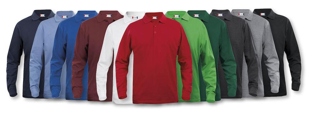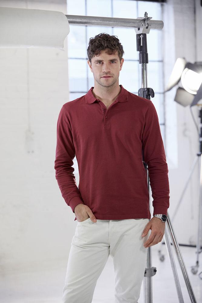 Klassisk langermet pique til herre. Knappestolpe med tre ton-i-ton knapper. Rib i ermavslutning. Splitt i sidene.