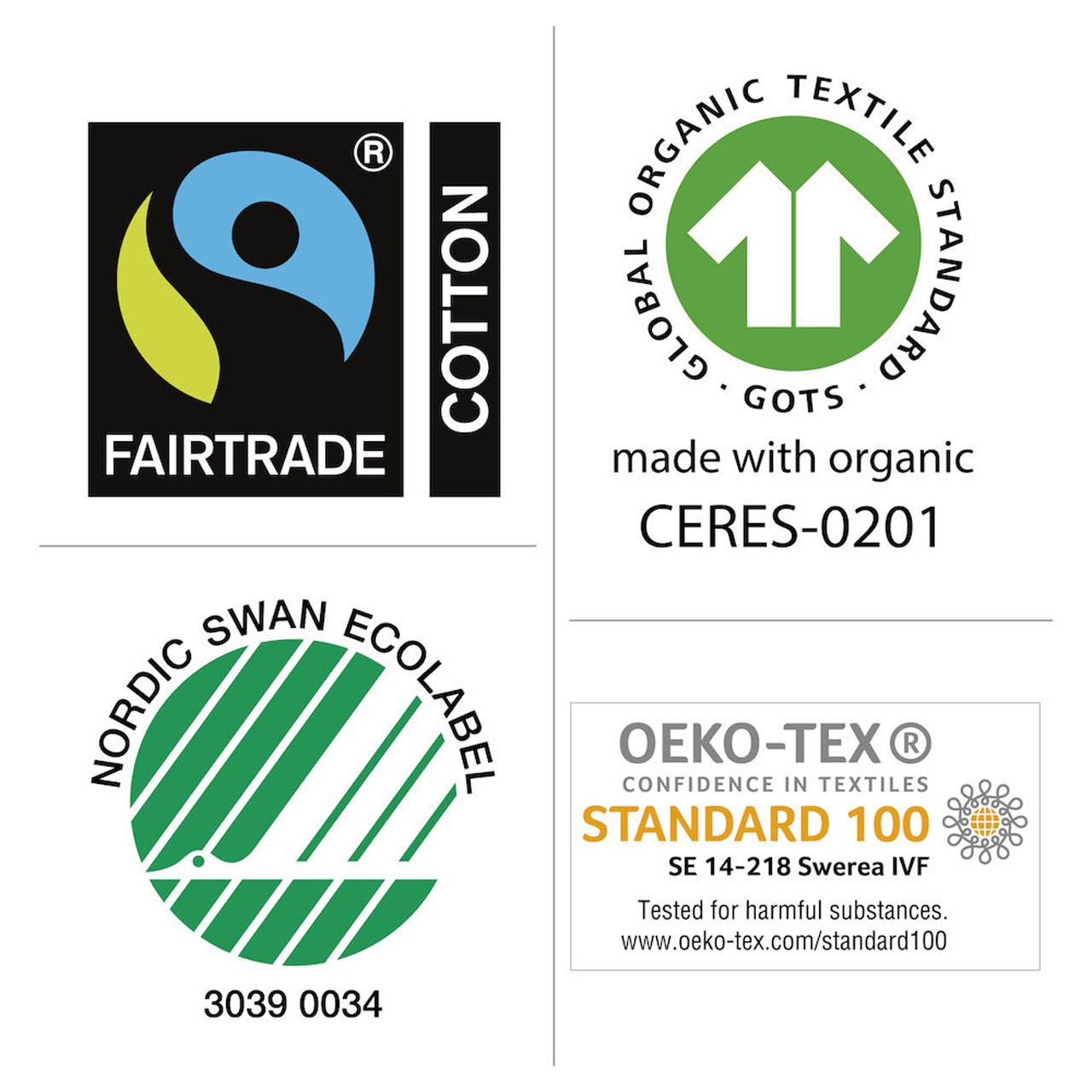 Produktene er sertifisert av Nordic Ecolabel, Fairtrade, GOTS og ØKO-TEX.