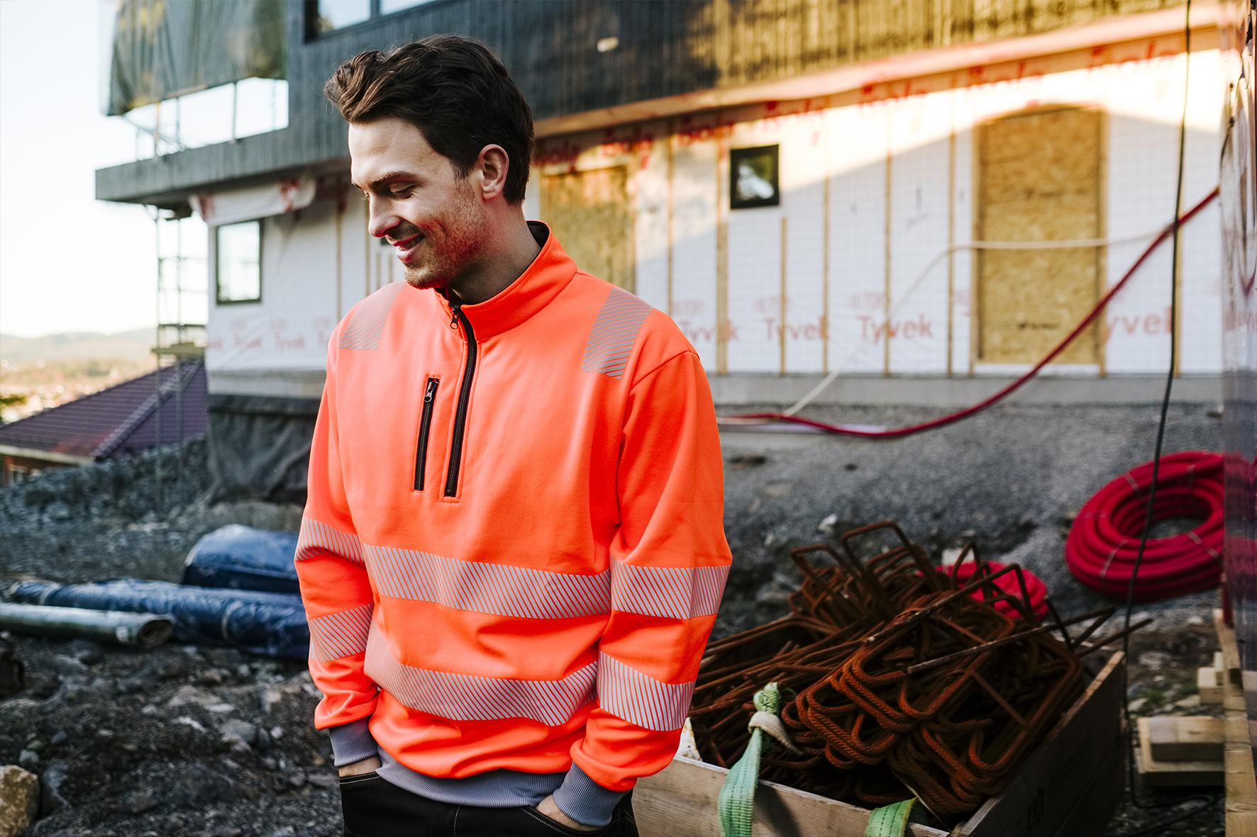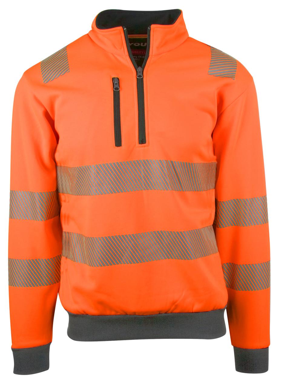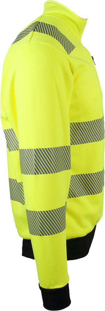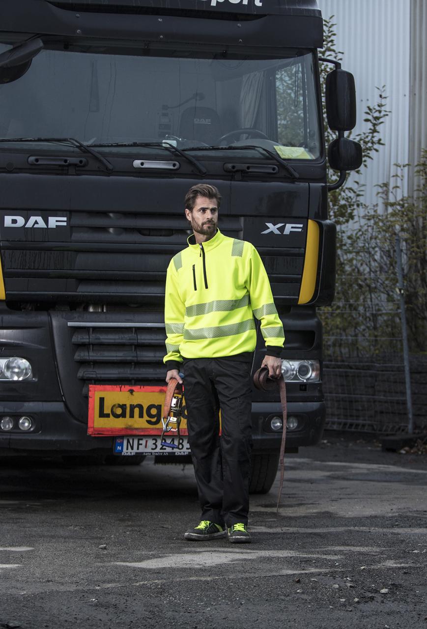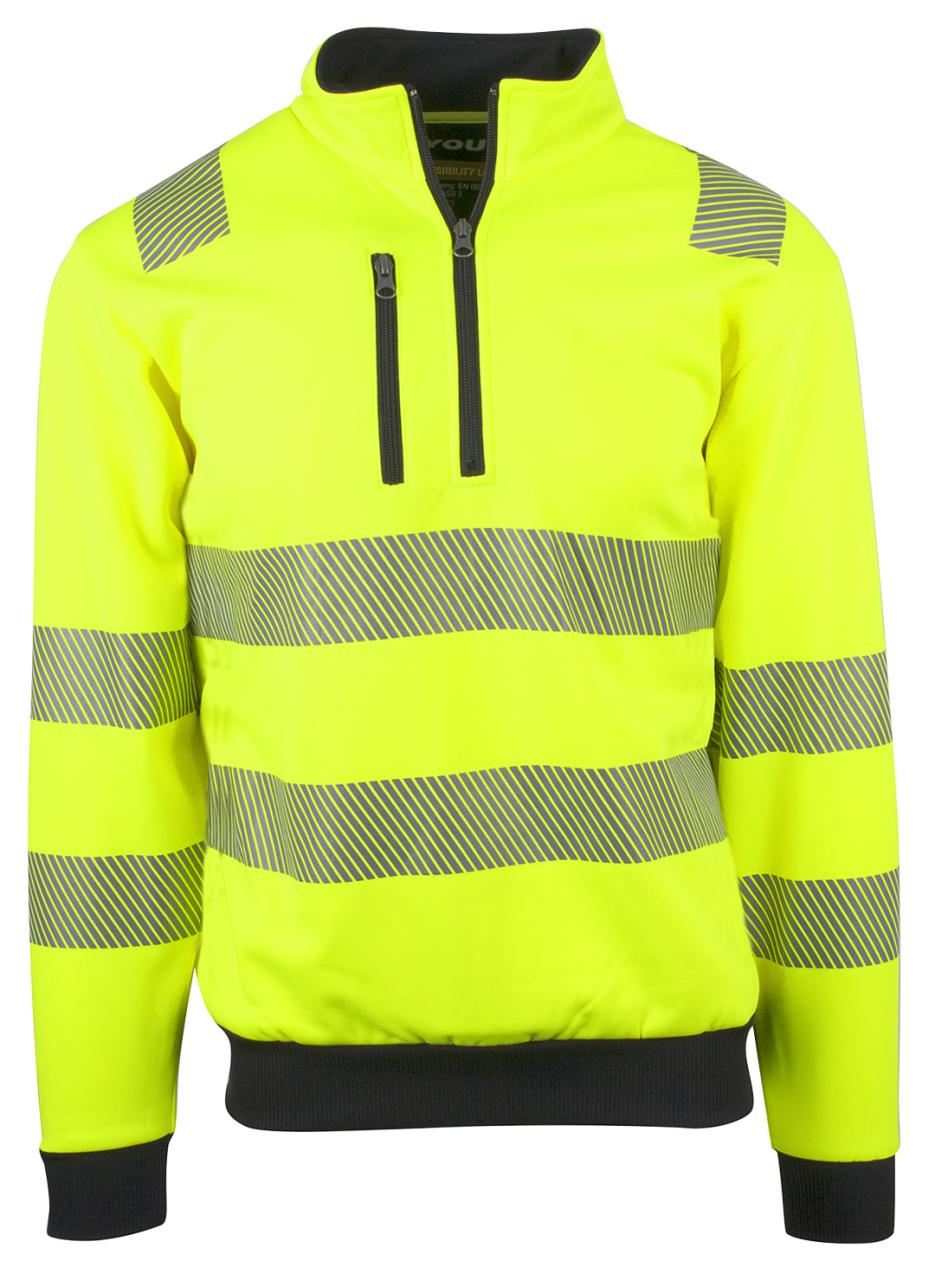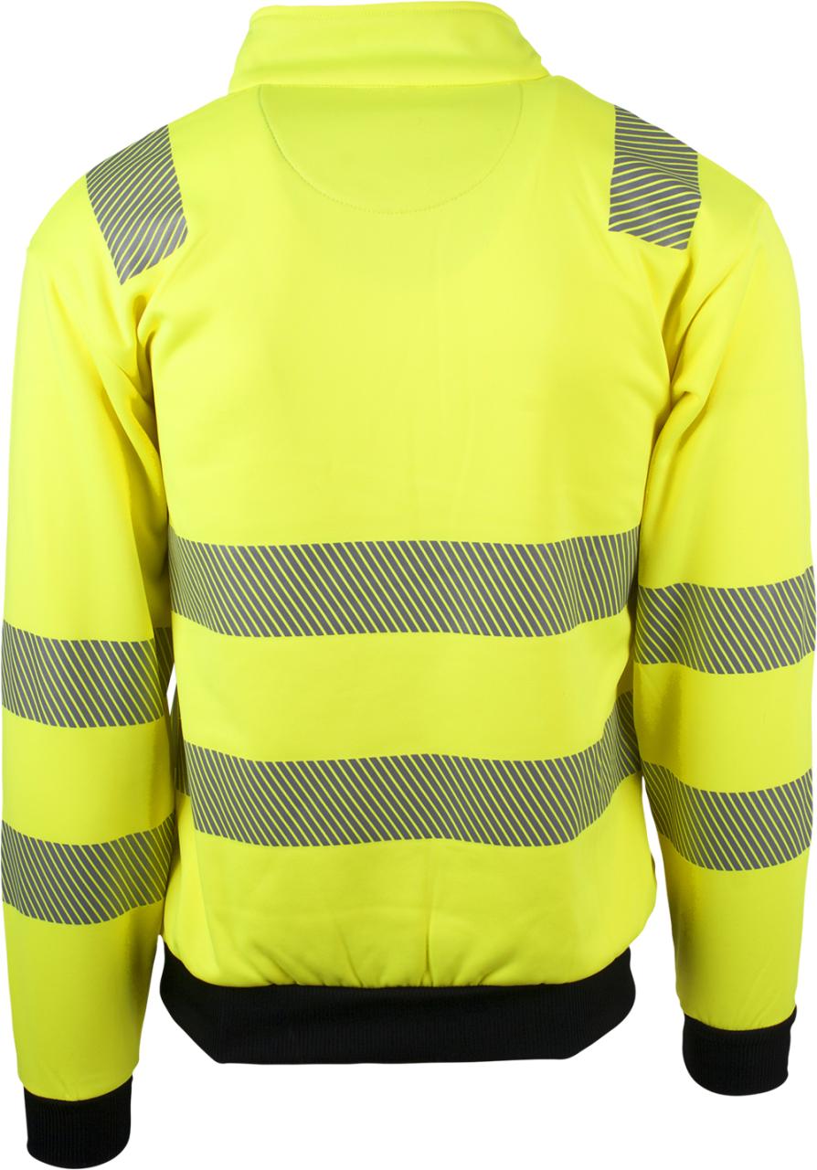 Unisex genser med elastisk refleks på skuldre, ermer og mage. 3/4 glidelås og brystlomme med glidelås. Kontrastrib på ermer og linning. Mediaport i lomme. CE-merket. EN 20471, klasse 3.