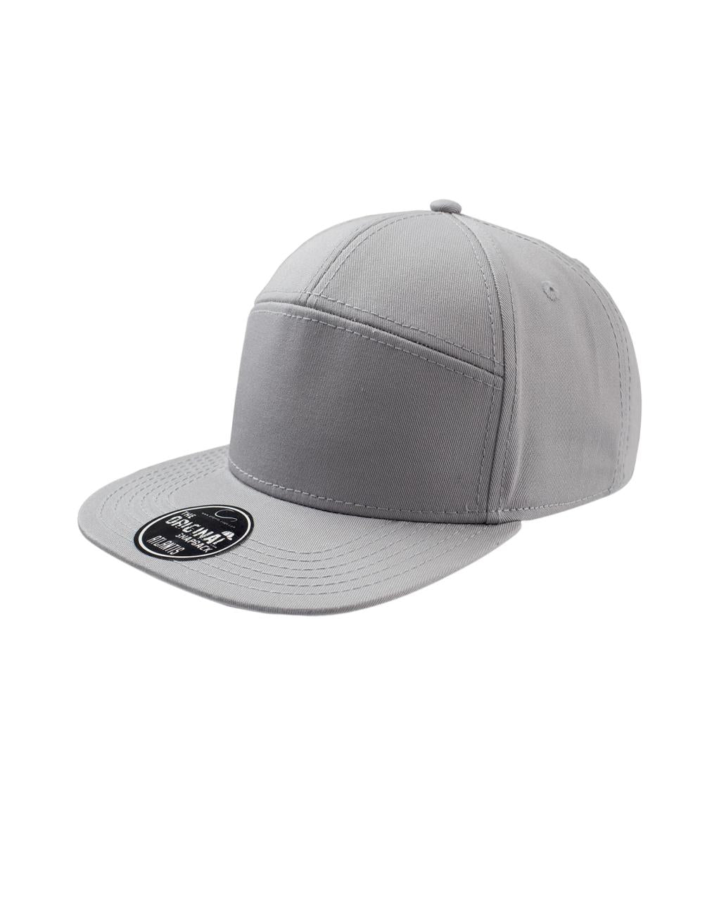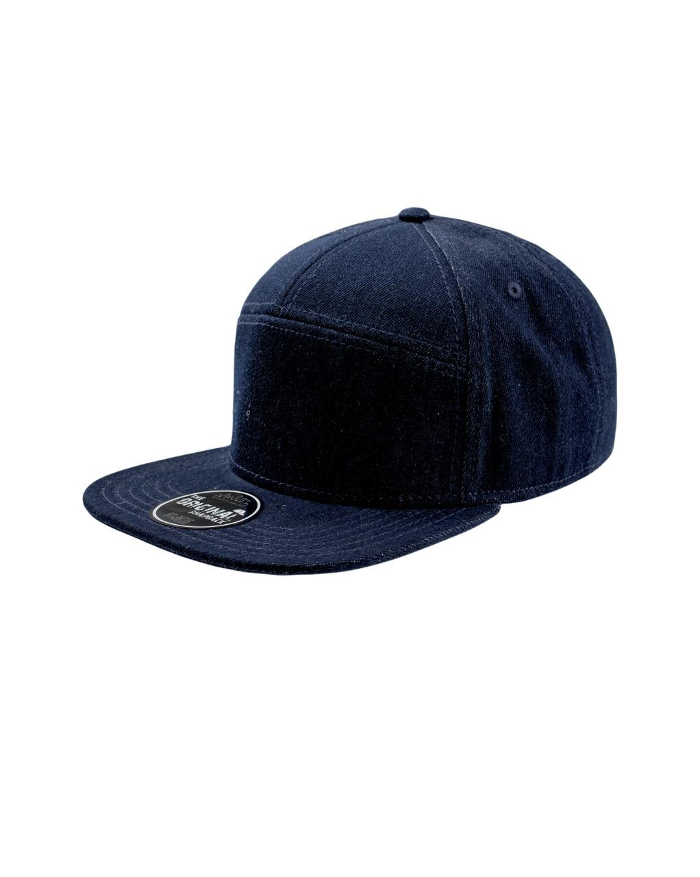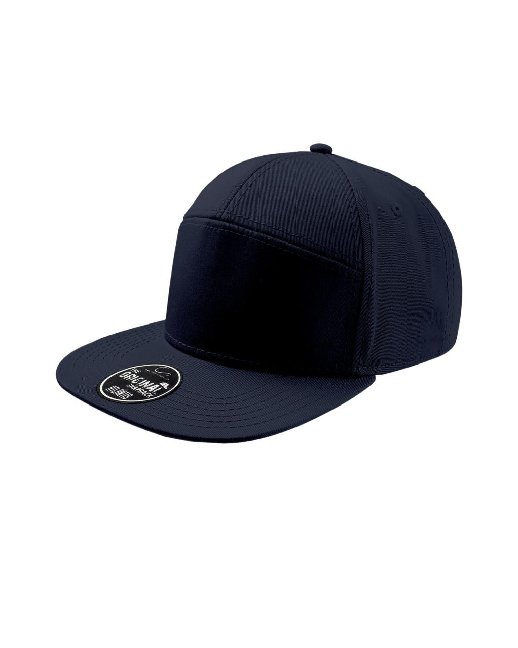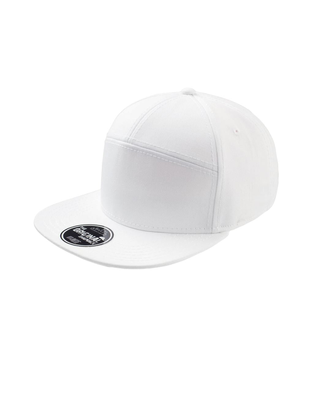 Street style cap med 7 paneler. Flat brem og høy profil. Regulerbar PVC-lukning. (snap back) Tear away label.