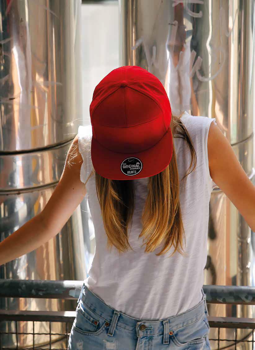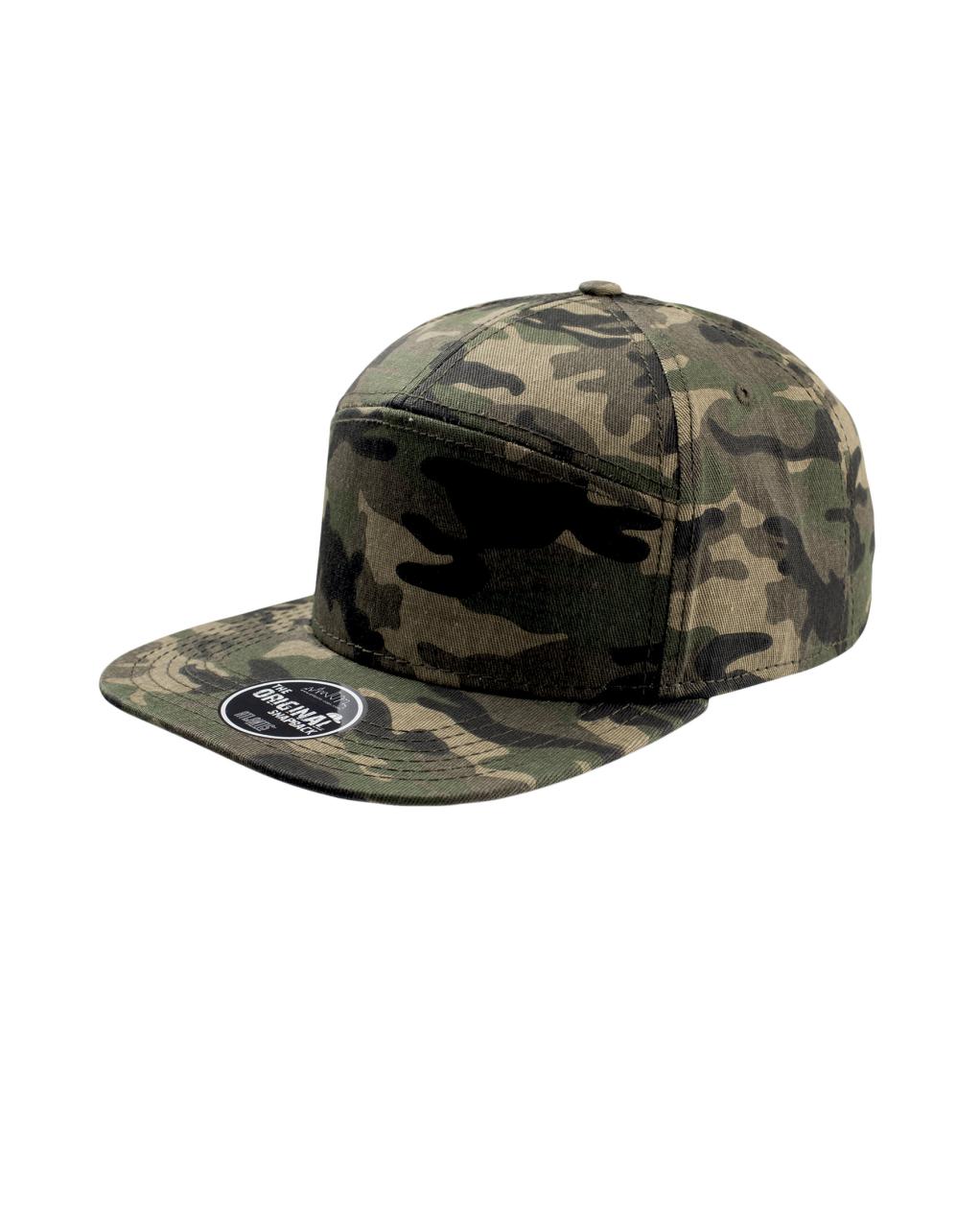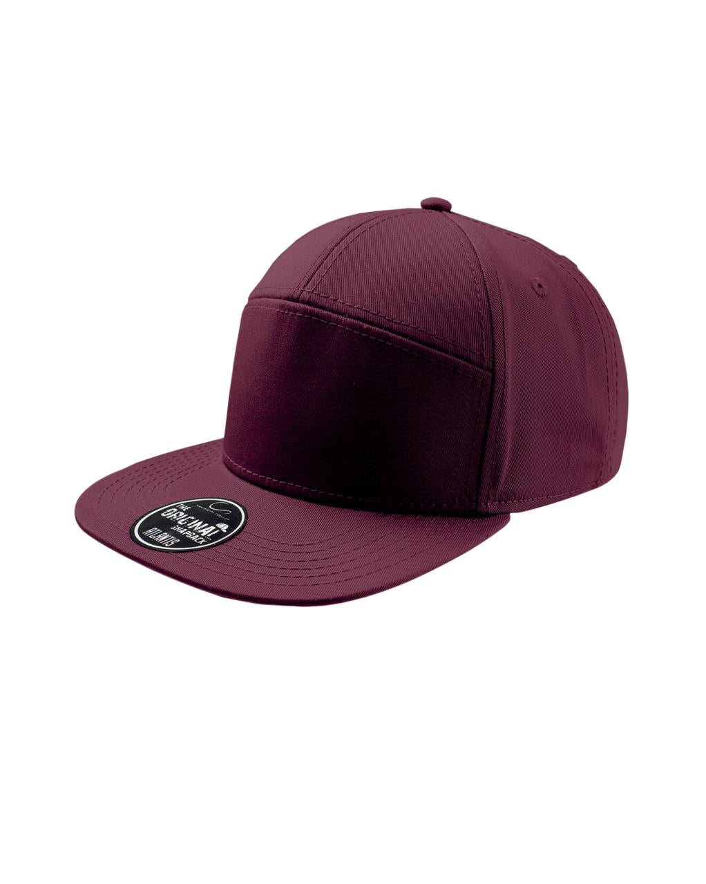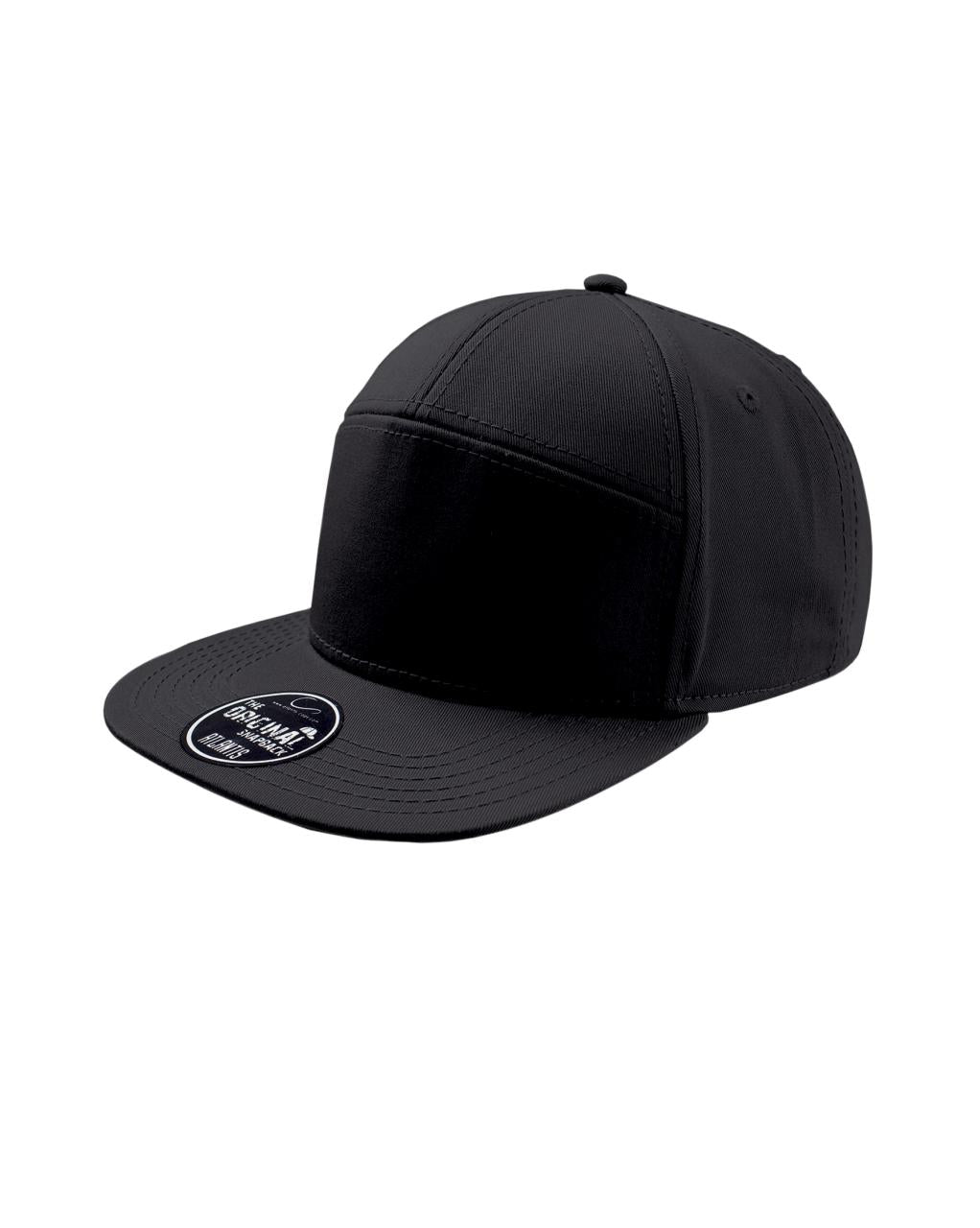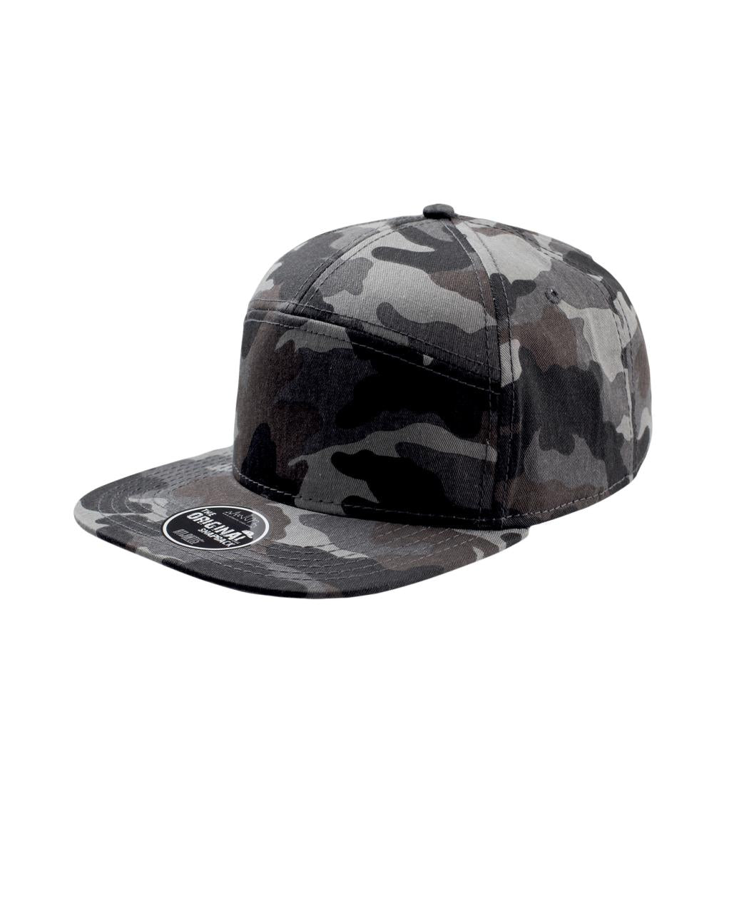 Street style cap med 7 paneler. Flat brem og høy profil. Regulerbar PVC-lukning. (snap back) Tear away label.