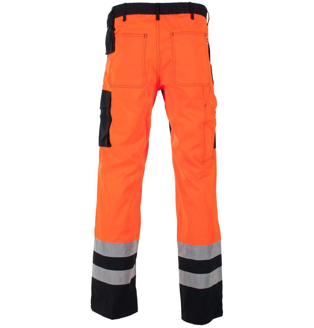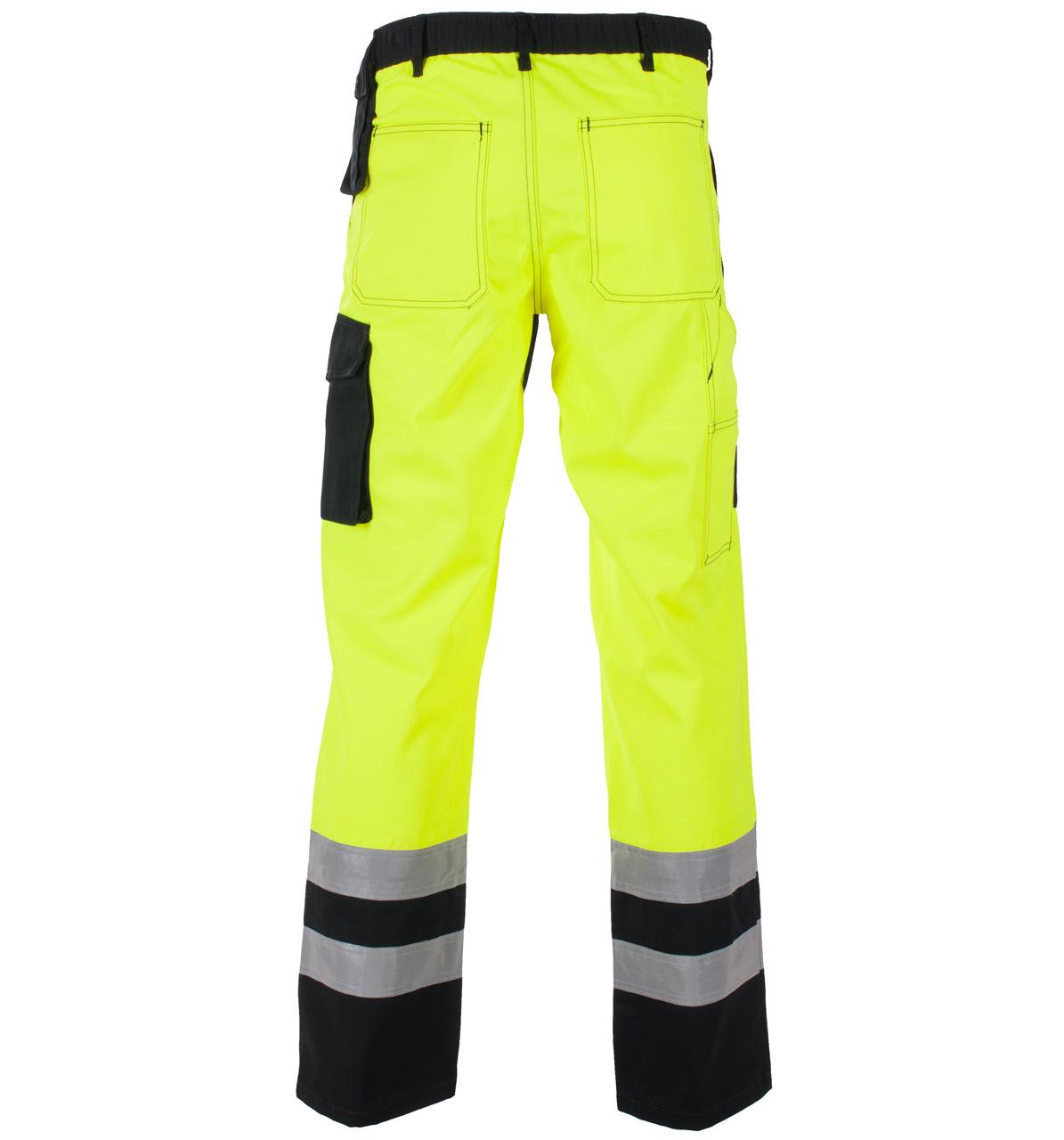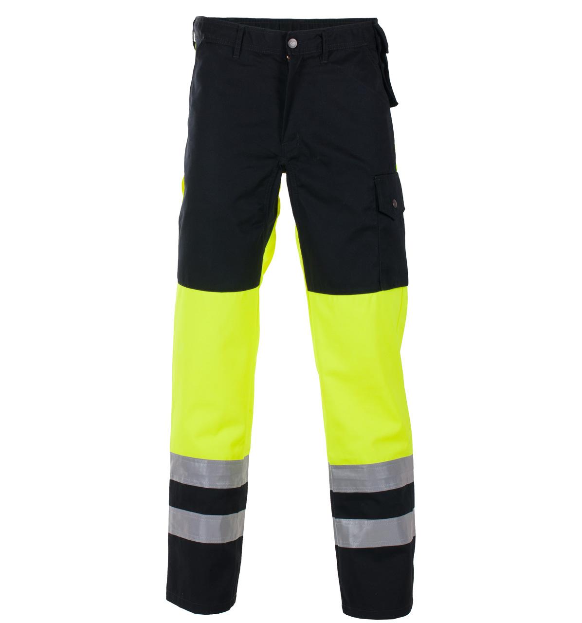 Synlighetsbukse for vei- og anleggsarbeid. Elastikk bak i linning, mobillomme m knapp, to stikklommer, baklommer, tommestokklomme og lårlomme. EN ISO 20471 Klasse 1.