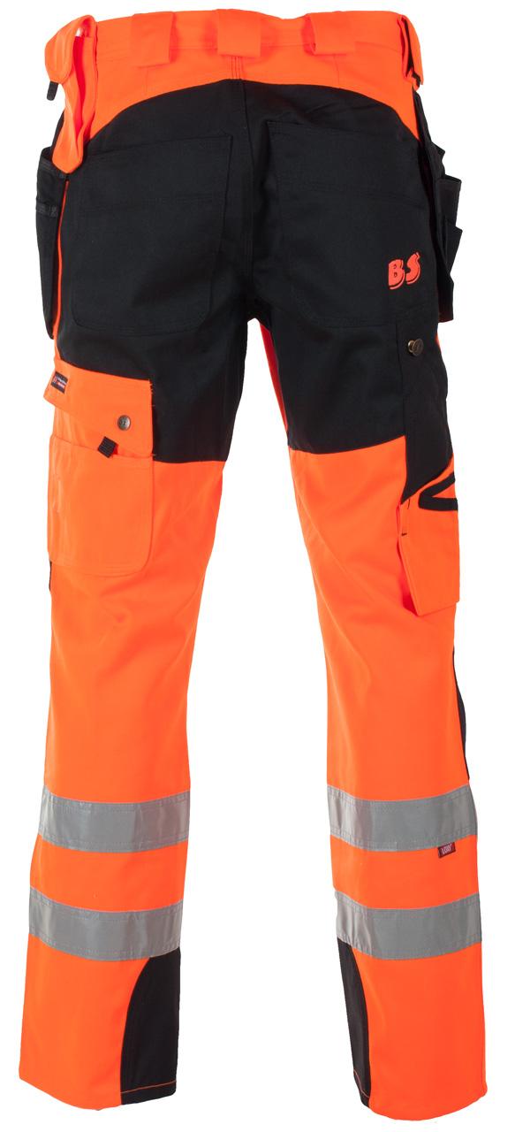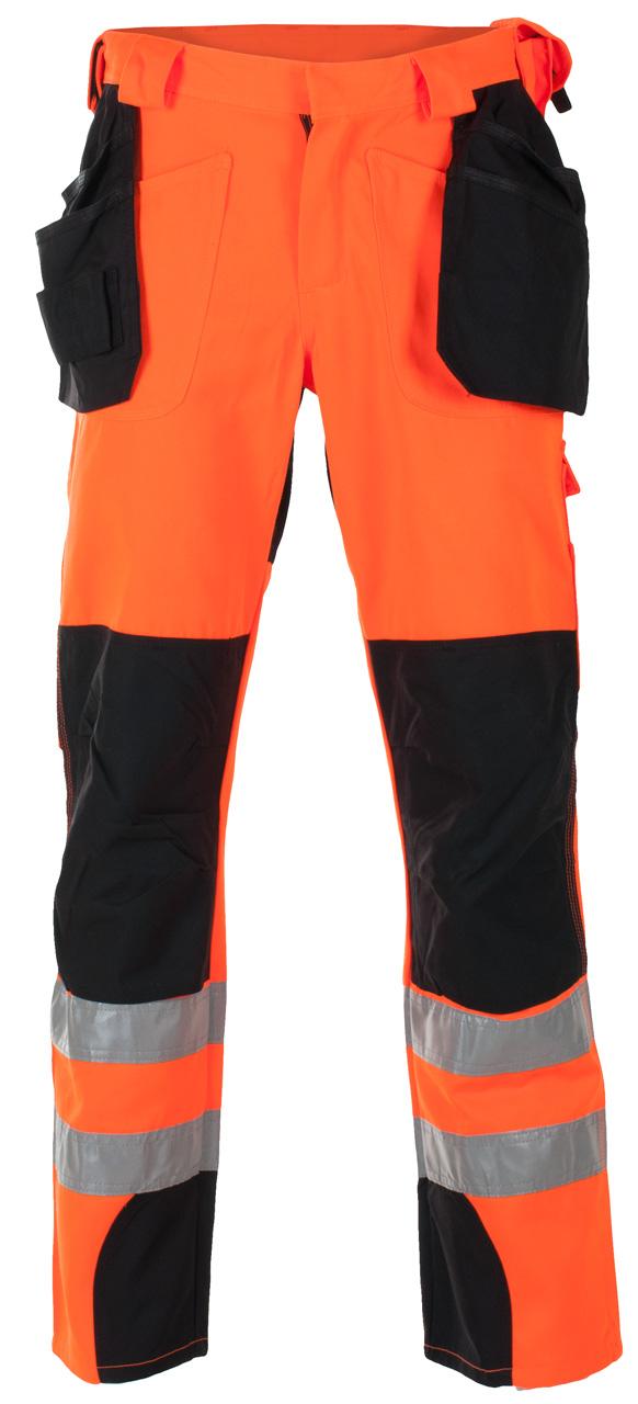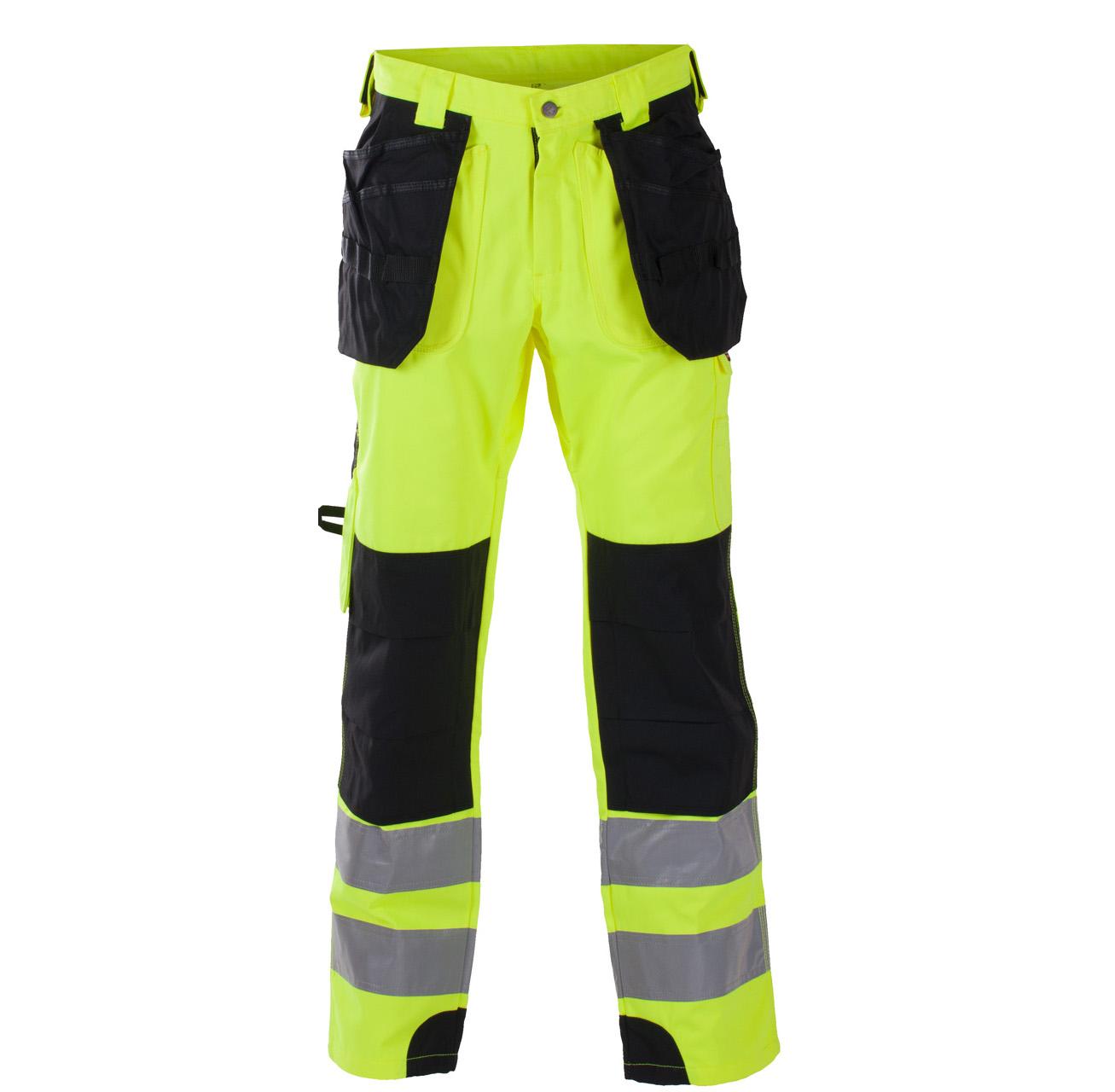 Bukse med hengelommer, knelommer, hammerholder, stikklommer, baklommer, lårlomme og tommestokklomme. Refleks på bein. EN 20471 kl 1.