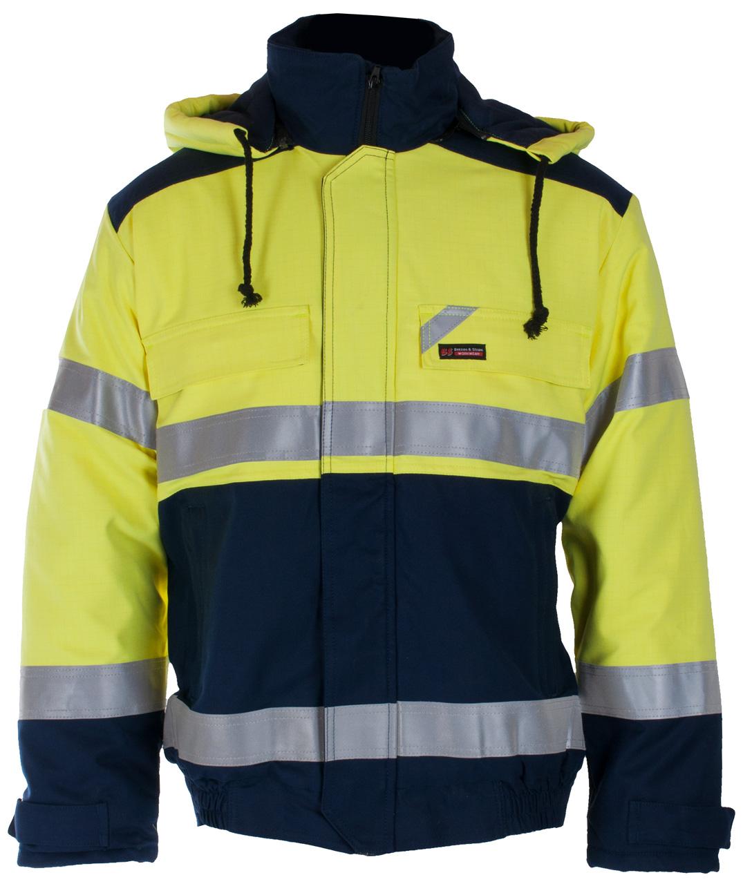Flammehemmende jakke, vattert, med glidelås med klaff i front. Brystlomme og mobillomme med klaff og stikklommer. Borrelåsstramming og strikk på ermer og i linning. Reflekser på ermer, bryst og mage.