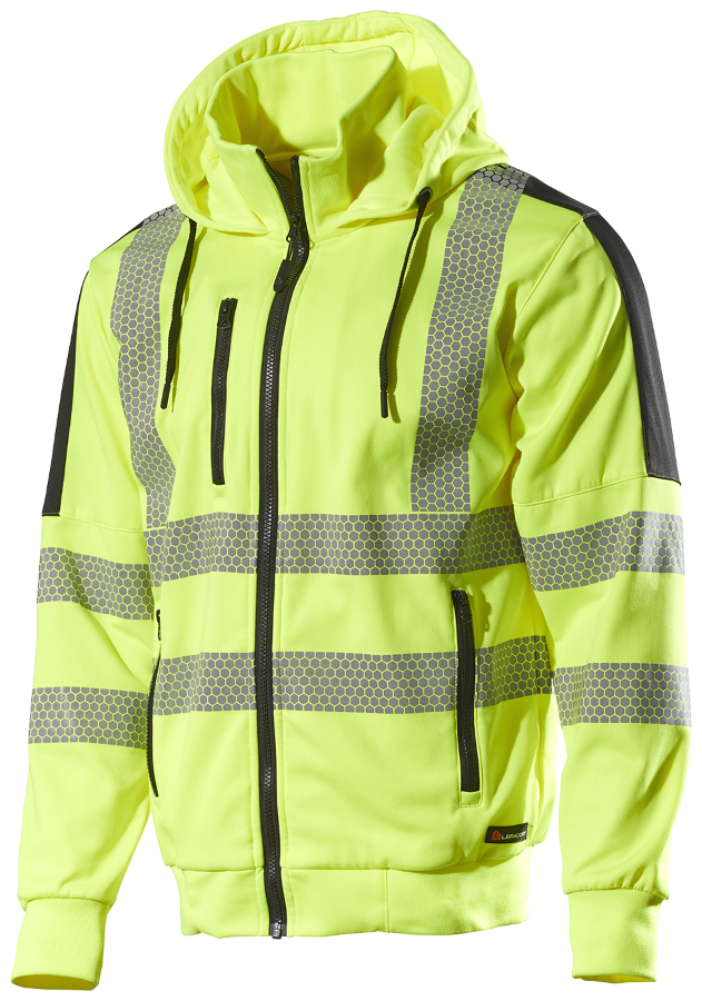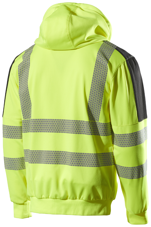 Hi-Vis-sertifisert collegegenser med både krage og hette for fleksibel bruk.