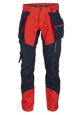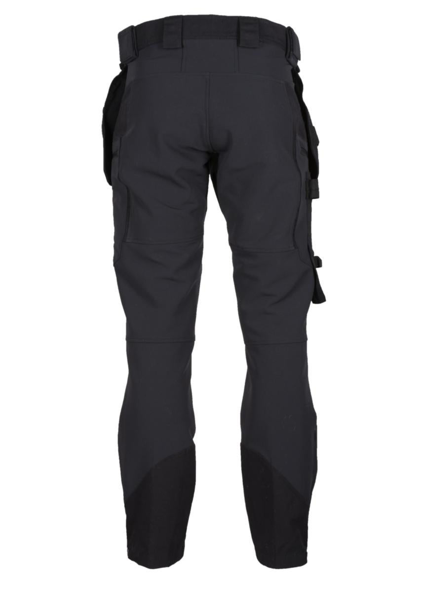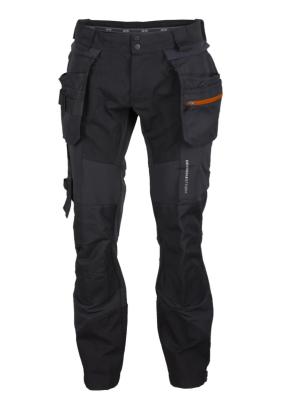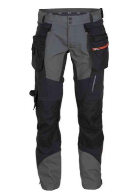Håndverksbukse med formsydde ben og paneler i 4-veis stretch for best mulig bevegelsesfrihet. T-stykke i skritt. To-nålssøm i ben, lommer og skritt. YKK® glidelås i gylf, to trykknapper og borrelås i linning. Brede beltehemper. Hempe med borrelås til hammerholder i begge sider i linning. Forlommer med SBS glidelås. Hengelommer i slitesterkt nylon forsterket med dobbel bunn. Høyre hengelomme med ett fakk, to hylsterlommer og fire hemper. Venstre hengelomme med ett fakk, to hylsterlommer og bitslomme med SBS glidelås. Hengelommene er avtakbare med YKK® glidelås og trykknapper. Tommestokklomme i slitesterkt nylon med utvendig blyantlomme, skjult knapp for kniv og justerbart bånd for slire. Tommestokklommen er delvis festet for best mulig bevegelsesfrihet. Lårlomme med glidelås på høyre ben. Lårlomme med SBS glidelås og innvendig ID-kortholder på venstre ben. Formsydde kneputelommer i slitesterkt nylon med utvendig innputt. SBS støvelglidelås i benavslutning og trykknapp for justering av benvidde. Hovedmateriale: 94% polyester/6% elastan, 320 g/m2. Sekundærmateriale: 65% polyester/35% bomull, 260 g/m2. Forsterkningsmateriale: 100% nylon, 220 g/m2.