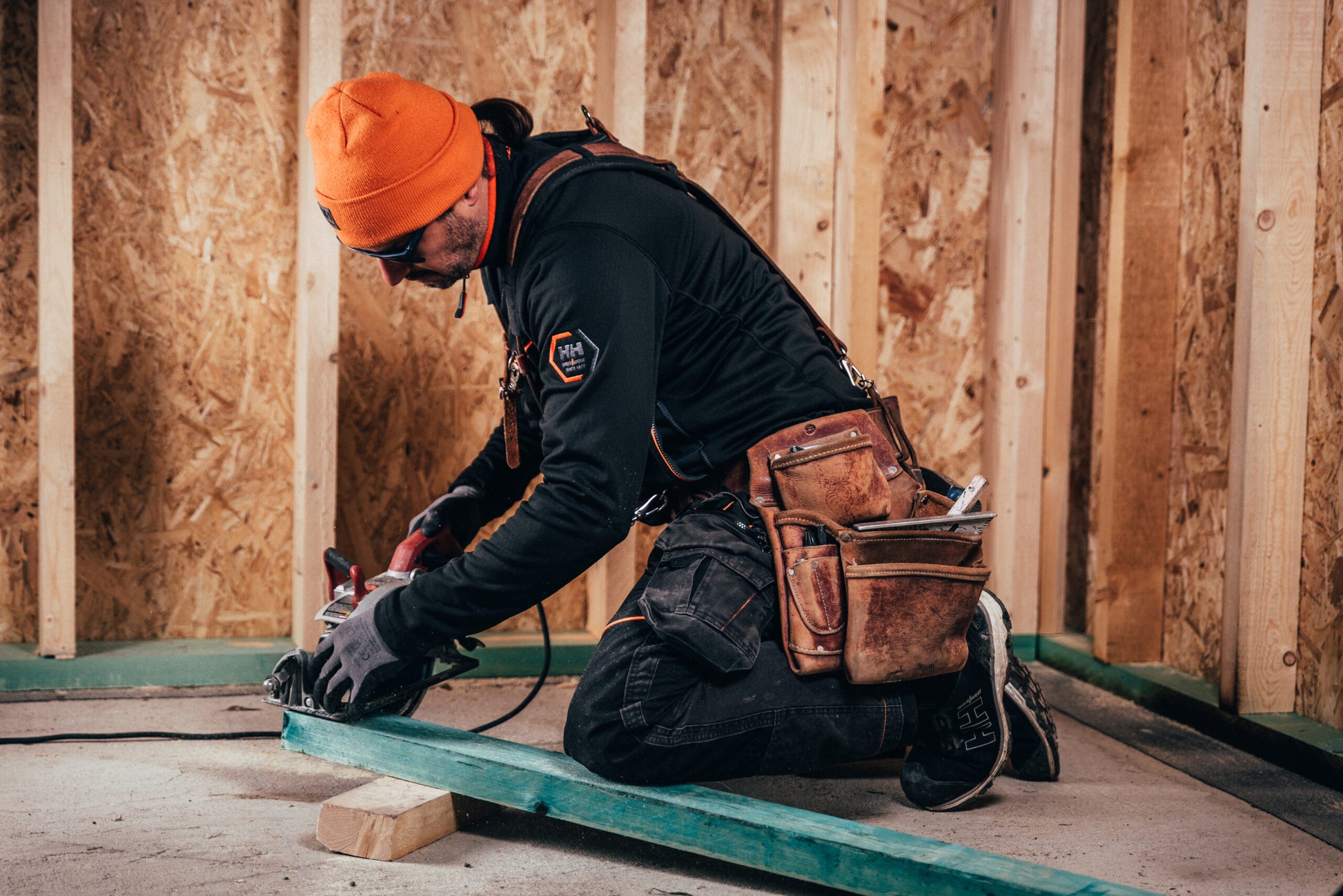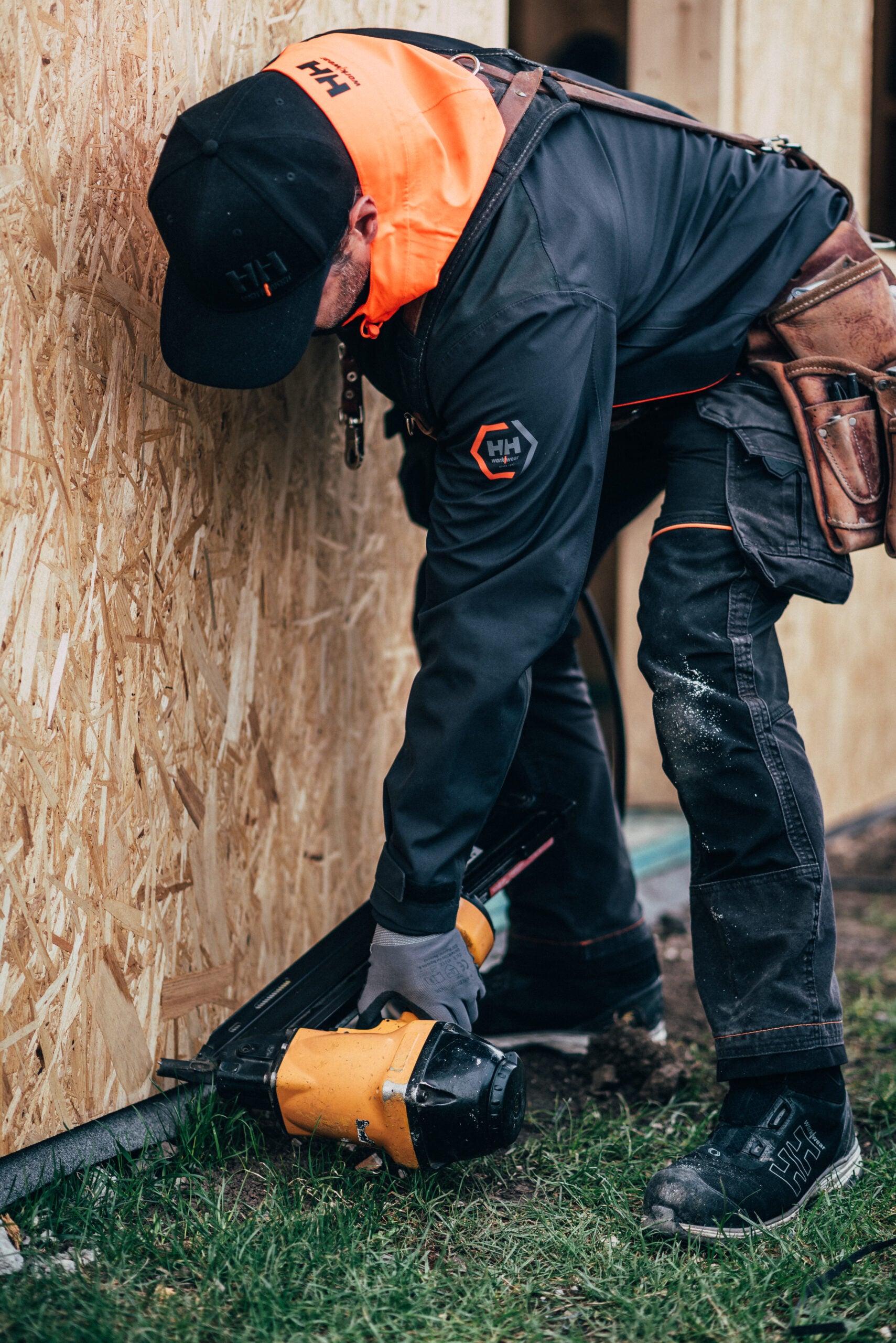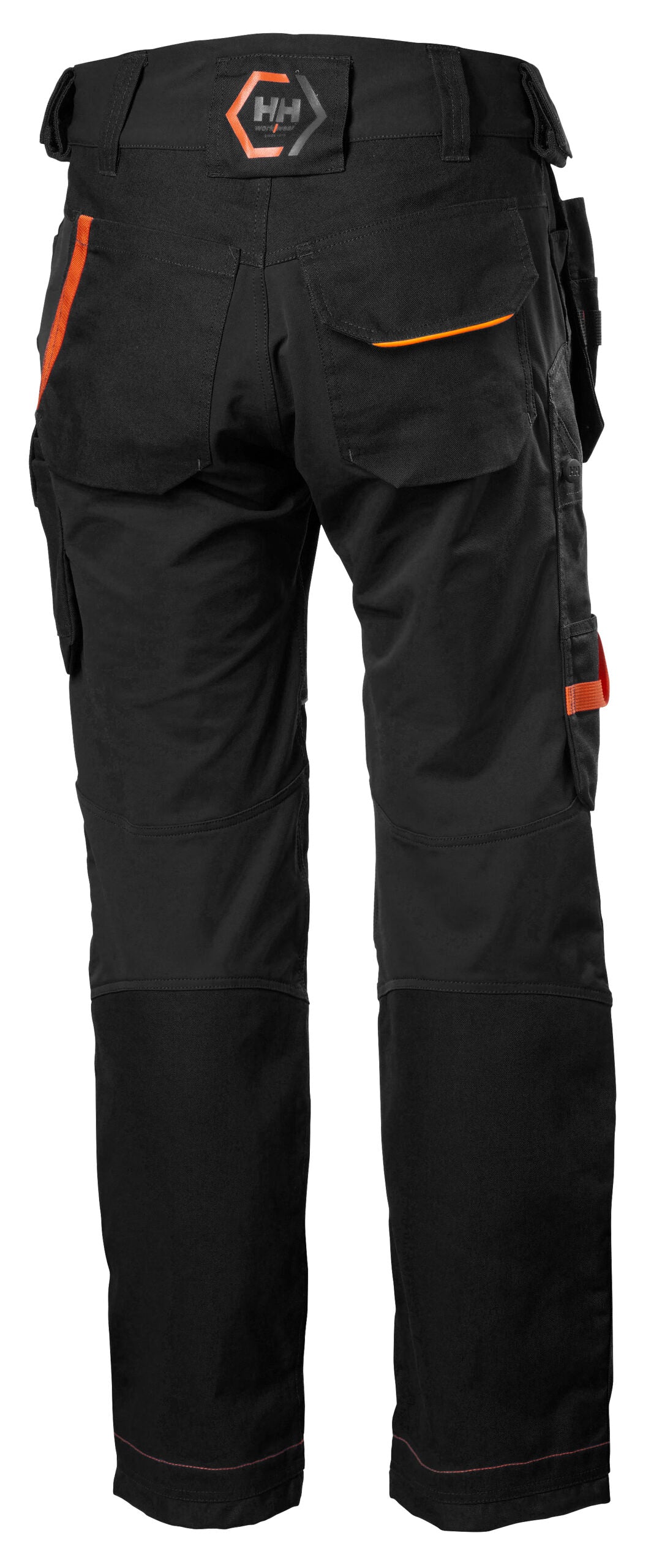 Håndverksbukse i moderne design. Formsydde ben. Optimal bevegelsesfrihet med paneler i 4-veis stretch. To-nålssøm i ben, lommer og skritt. Forsterket i skritt med kile. YKK® glidelås i gylf og plastbelagt knapp i linning. Brede beltehemper. To forlommer. To hengelommer i Cordura® forsterket med dobbel bunn, den høyre med ett fakk, tre hylsterlommer og tre hemper. Venstre hengelomme med ett fakk, tre hylsterlommer, fire hemper og bitslomme med YKK® glidelås. Tommestokklomme i Cordura® med plastbelagt knapp og hempe for kniv og liten utvendig lomme, forsterket med dobbel bunn og delvis festet for optimal bevegelighet. To baklommer, den høyre med klaff og borrelås, begge lommene delvis festet for optimal bevegelighet. Lårlomme på venstre ben med klaff med borrelås og to utenpåliggende lommer med ekspansjonsfold, innvendig hempe til ID-kortholder, delvis festet for optimal bevegelighet. Kneputelommer i Cordura® med innputt fra innsiden. Kneputene kan justeres +/- 5 cm for god tilpasning. Forsterket benavslutning i Cordura®. Nedfellbar fold på 5 cm i benavslutning for ekstra lengde.
