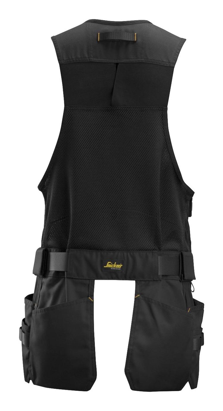 Håndverksvest med netting i front og rygg for best mulig ventilasjon. Brede ergonomiske skulderstropper, høydejusterbare med borrelås. Brede elastiske bånd øverst på rygg for god bevegelsesfrihet. Kraftig glidelås i front. Utstyrt med ekspansjonsfold med glidelås i front som muliggjør bruk over jakke. Belte med plastspenne, avtakbart. Brede beltehemper. Hempe med borrelås til hammerholder i begge sider i linning. Brystlommer i Cordura®, venstre brystlomme uten klaff, med utvendig pennelomme, liten lomme og polstret telefonlomme med klaff med borrelåslukking. Høyre brystlomme med klaff med borrelåslukking, utvendig knapp og hempe til kniv og innvendig hempe til ID-kortholder. Vertikal åpning med borrelåslukking under begge brystlommer for oppbevaring. Spiker- og verktøylommer i Cordura® under begge brystlommene, begge med ekspansjonsfold, ett fakk, to utvendige lommer og klaff med borrelåsfeste for lukking av alle lommene. Fire hengelommer, alle i Cordura® og forsterket med dobbel bunn. Høyre hengelomme foran med ett fakk, tre hylsterlommer og fire hemper. Venstre hengelomme med ett fakk, to hylsterlommer og fem hemper. Begge hengelommer bak med ett fakk. Hempe i linning bak på høyre side. Kraftig utvendig nakkehempe.