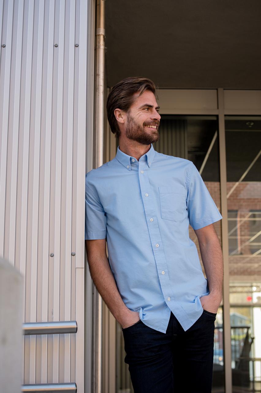 Oxfordskjorte til herre i myk og slitesterk bomullskvalitet.Fasongsydd modell med korte og lange ermer, brystlomme og «button down» krage. Klassisk knepping og mansjetter.