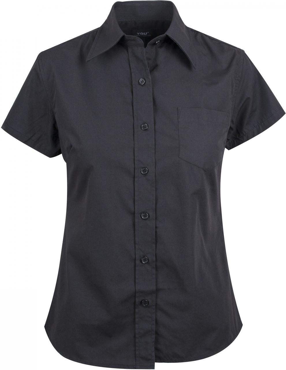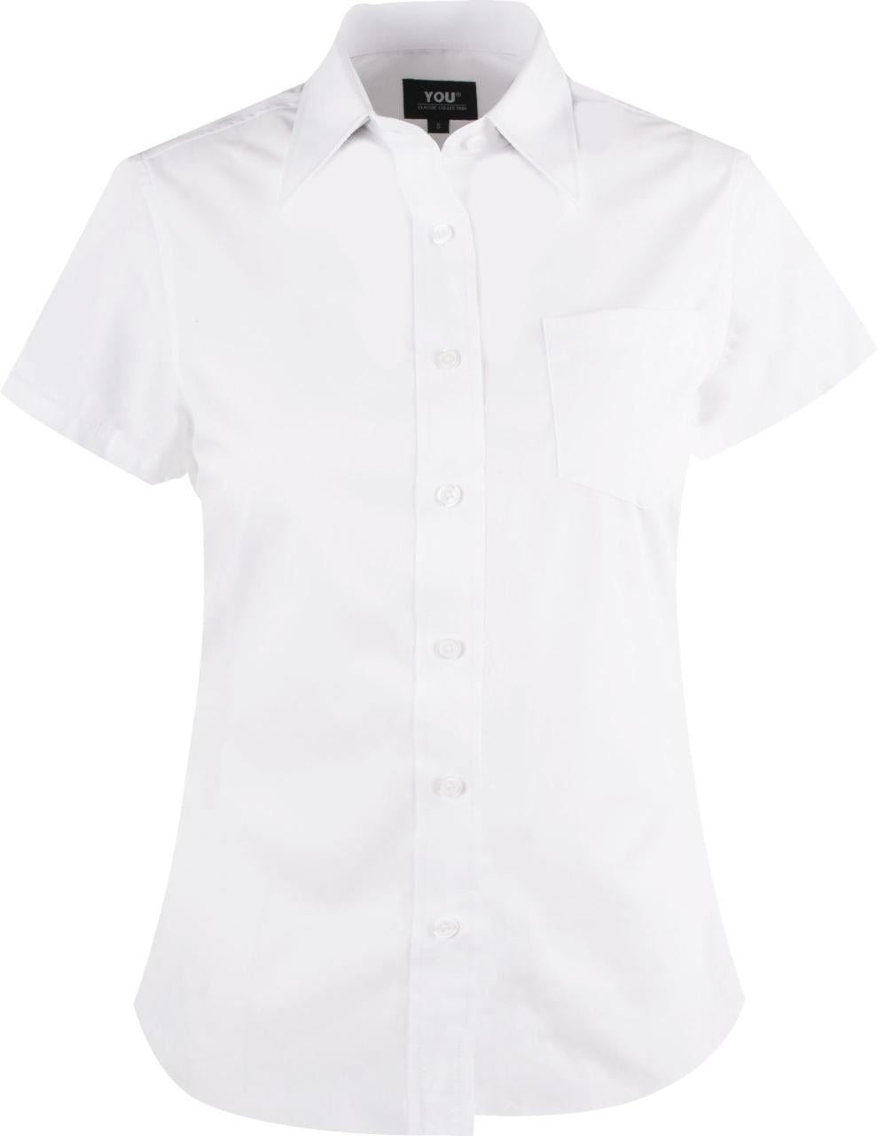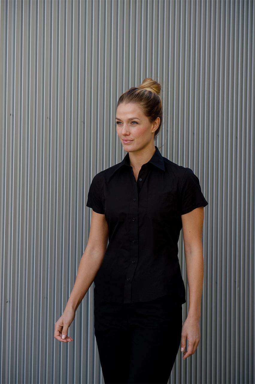 Figursydd poplinskjorte med brystlomme og korte ermer til dame. Strykelett og rask tørk. Matcher 8450 Venezia.