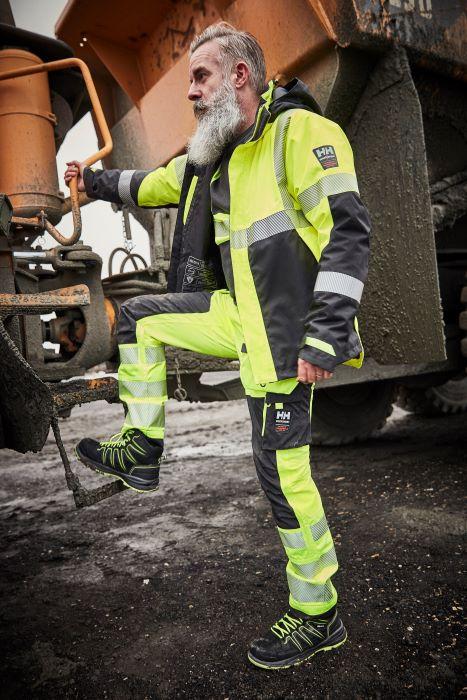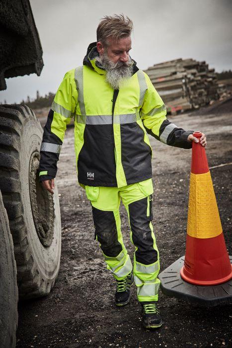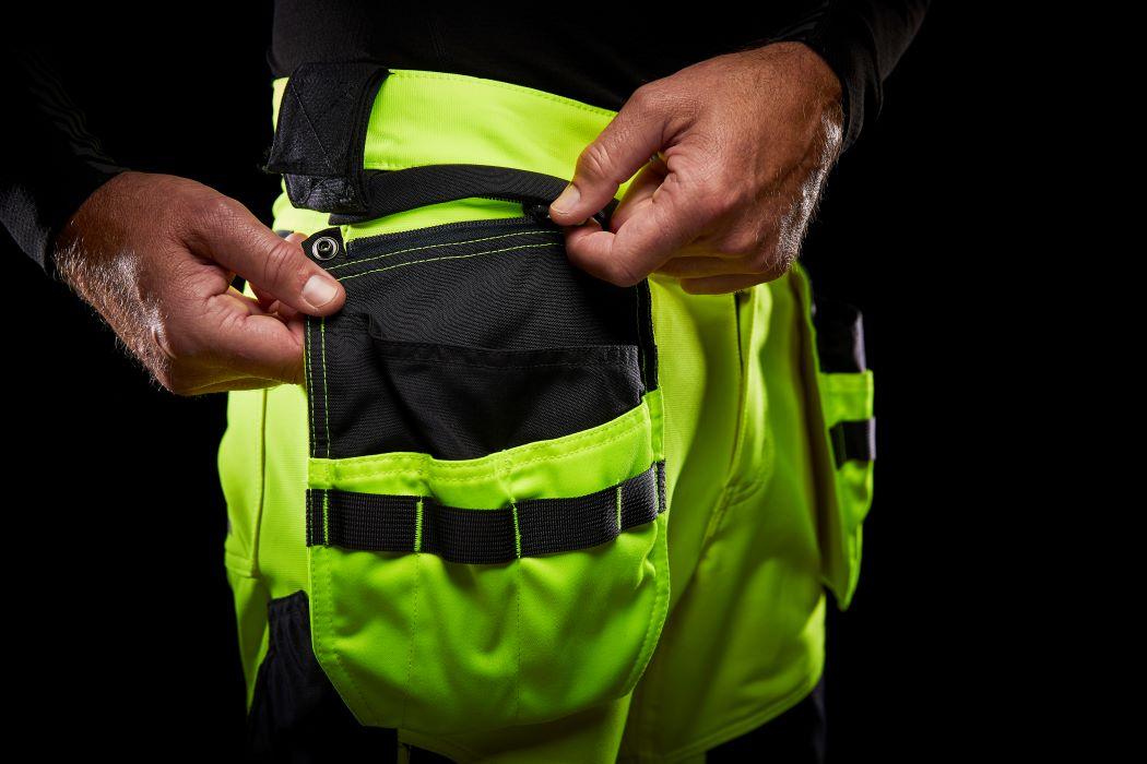 Håndverksbukse i moderne design. Formsydde ben. Optimal bevegelsesfrihet med paneler i 4-veis stretch. To-nålssøm i ben, lommer og skritt. Forsterket i skritt med kile. YKK® glidelås i gylf og plastbelagt knapp i linning. Brede beltehemper. To forlommer i 4-veis stretch. To hengelommer i Cordura® forsterket med dobbel bunn, begge med ett fakk, tre hylsterlommer og fire hemper. Hengelommene er på- og avtakbare med YKK® glidelås og trykknapper. Tommestokklomme i Cordura® med plastbelagt knapp og hempe for kniv og liten utvendig lomme, forsterket med dobbel bunn og delvis festet for optimal bevegelighet. To baklommer i 4-veis stretch, den venstre med klaff og borrelås. Lårlomme i Cordura® med vertikal YKK® glidelås og utenpåliggende mobiltelefonlomme med ekspansjonsfold og klaff med borrelås, delvis festet for optimal bevegelighet. Kneputelommer i Cordura® med innputt fra innsiden. Kneputene kan justeres +/- 5 cm for god tilpasning. Forsterket benavslutning i Cordura®. 50 og 70 mm 3M™ Scotchlite™ segmentert påtrykt refleks på ben.