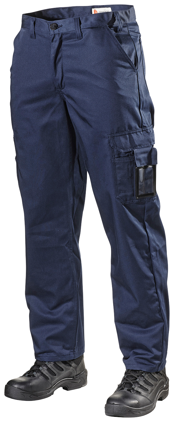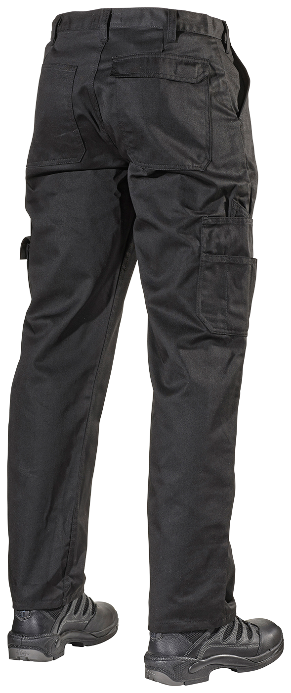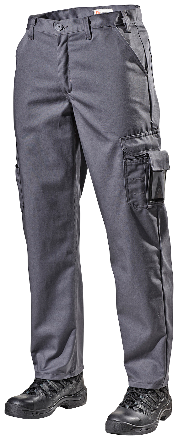 To frontlommer og to baklommer. To lårlommer på høyre ben, en med tommestokklomme og rom for skyvelær. En større lomme på venstre ben med telefon- og ID-kortlomme.