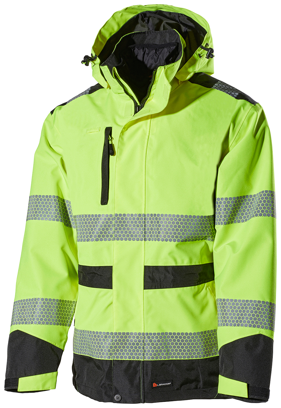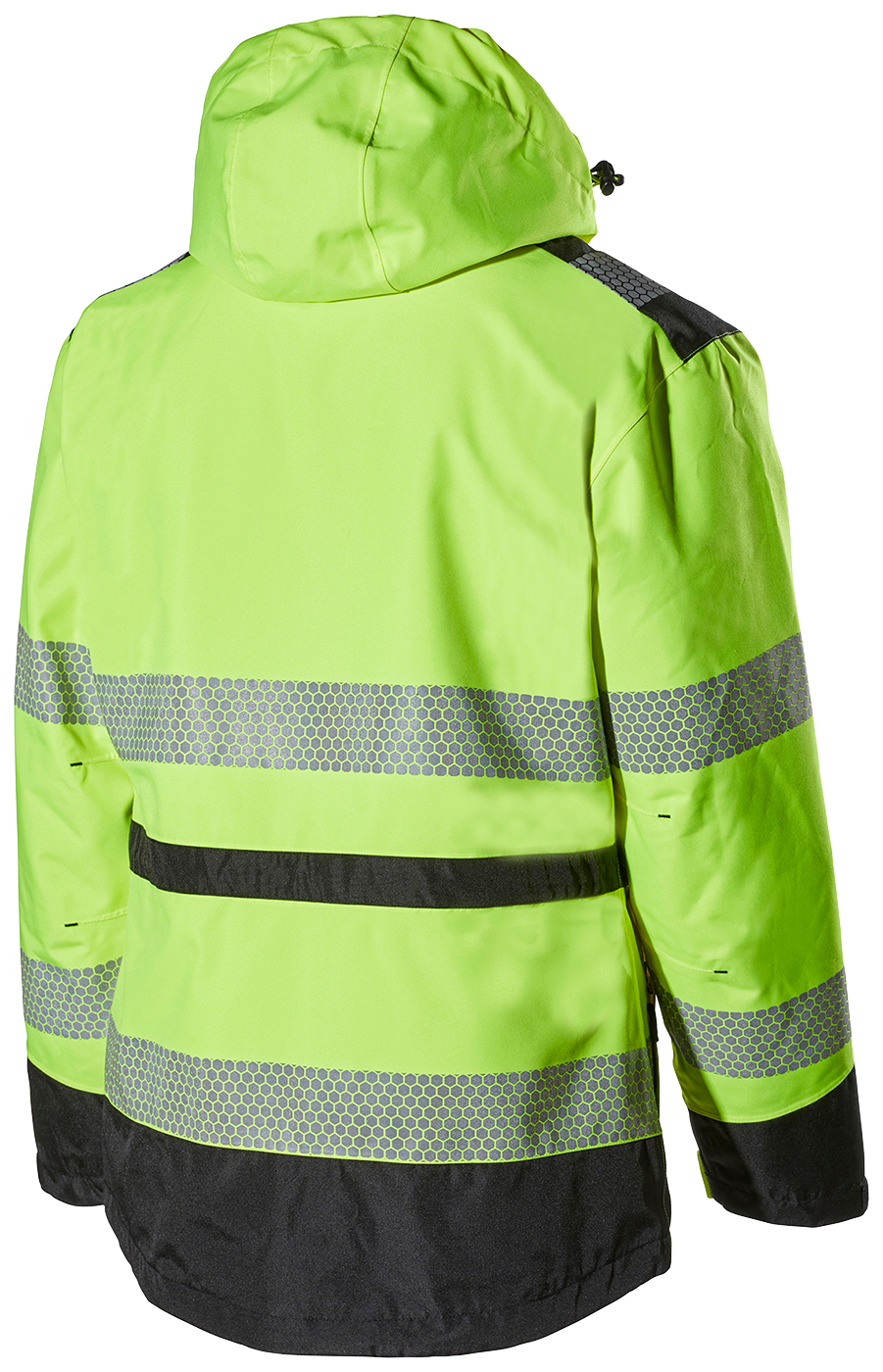 Tre-i-en-jakke der du kan ha på deg bare det svarte fôret, bare ytterjakken eller begge deler samtidig. Den beskytter mot vind og kulde og som tåler tøffe tak, samtidig som den oppfyller de strengeste EN-kravene til synlighet. Arbeidsjakken er laget av vann- og vindtett materiale med gode pusteegenskaper, og den har teipede sømmer.