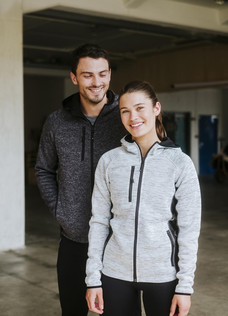 Sporty strikket hettejakke til dame. Funksjonelt og stilig design. En lett og luftig hettejakke som er velegnet før, under og etter aktivitet. Elastisk hette med kontrast. Glidelås i front og sidelommer. Brystlomme med glidelås. YKK glidelås. Justerbar linning.
