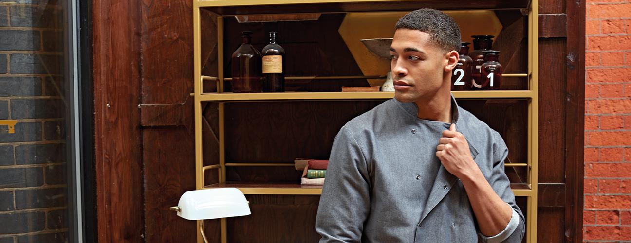 Deniminspirert unisex kokkejakke, et trendy alternativ til de tradisjonelle hvite og sorte modellene. Med inspirasjon fra den bestselgende P665 'Long Sleeve stud jacket', har denne modellen fått en moderne vri ved å introdusere den i to populære denimfarger. Mykt, pustende og bomullsrikt stoff.