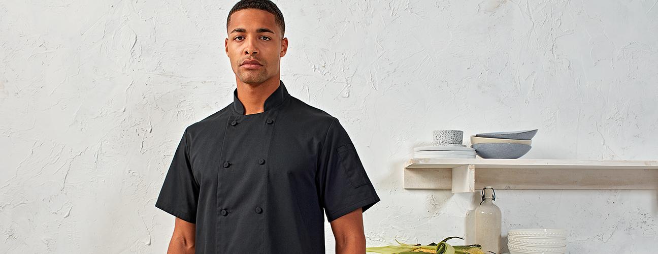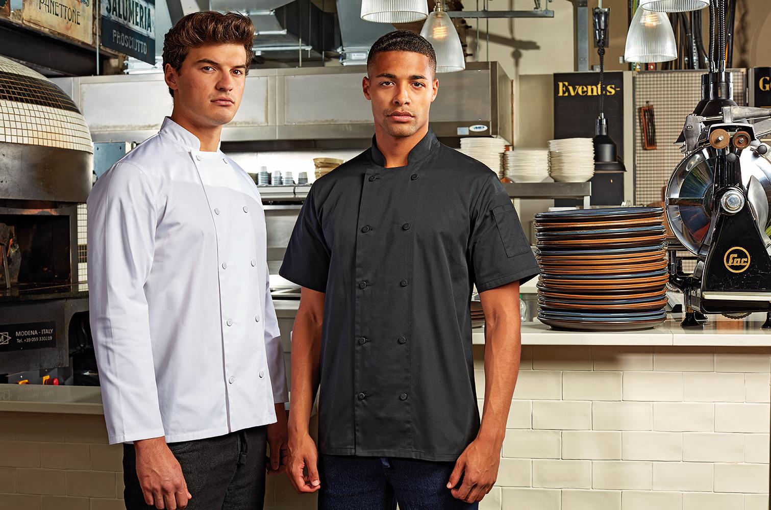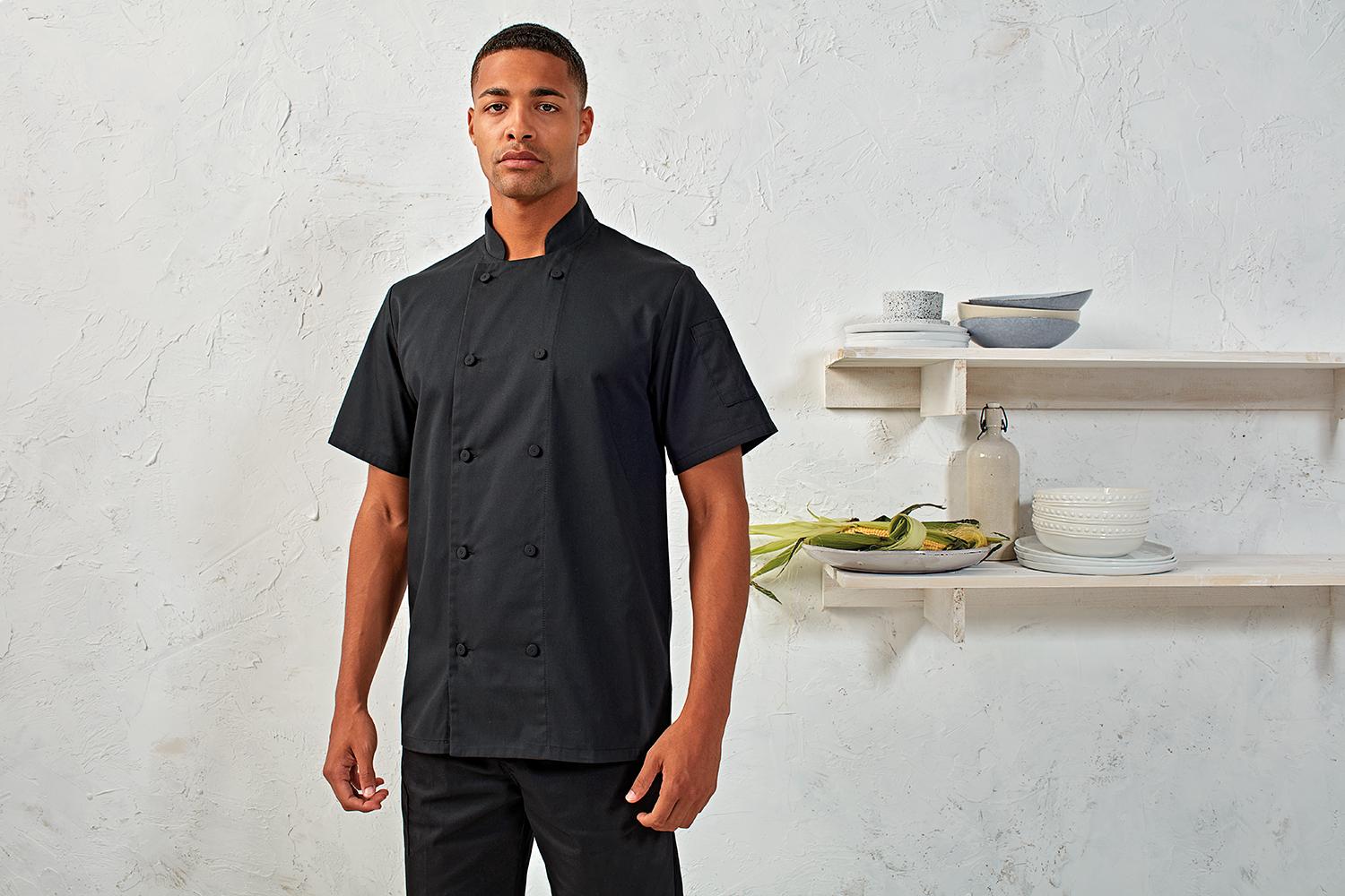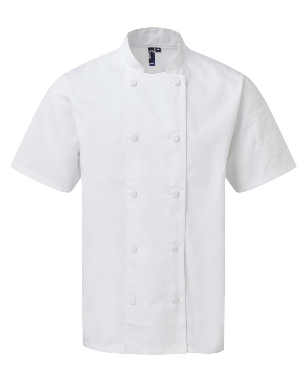 Kortermet unisex kokkejakke konstruert med Coolchecker®-stoff. Senterets bakpanel er laget av Coolchecker® som gir en eksepsjonell fukttransporterende egenskap slik at kokken holder seg fresh og kjølig hele dagen. Omslagsfeste med ti stk. ton-i-ton knapper, kinakrave og en praktisk dobbel pennelomme på venstre erme.