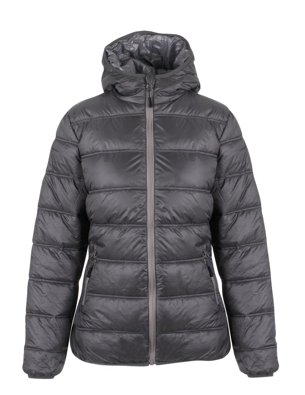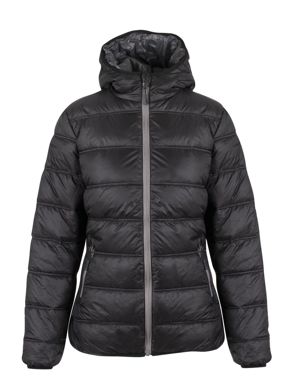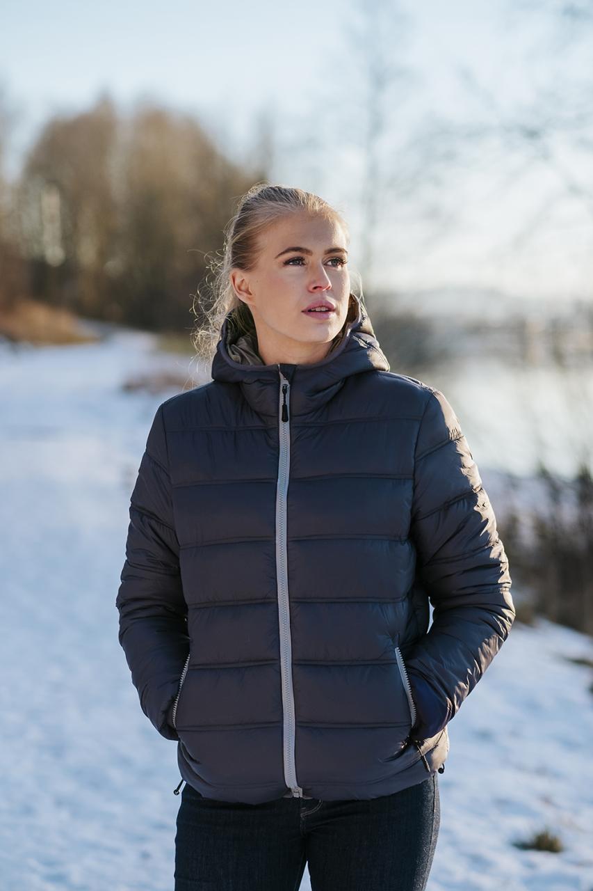 Termisk jakke til dame. Moderne og sporty design som passer godt til tur og fritid. Glidelås i front, frontlommer med glidelås og innelomme med glidelås. Egen lomme for bearbeiding. Elastisk hette, mansjetter og linning. Justerbar linning.