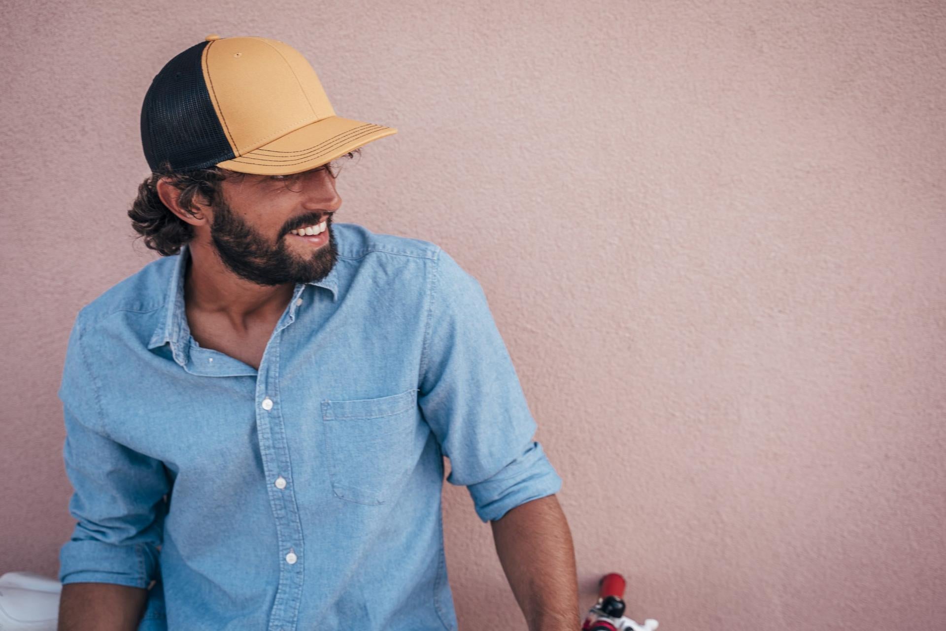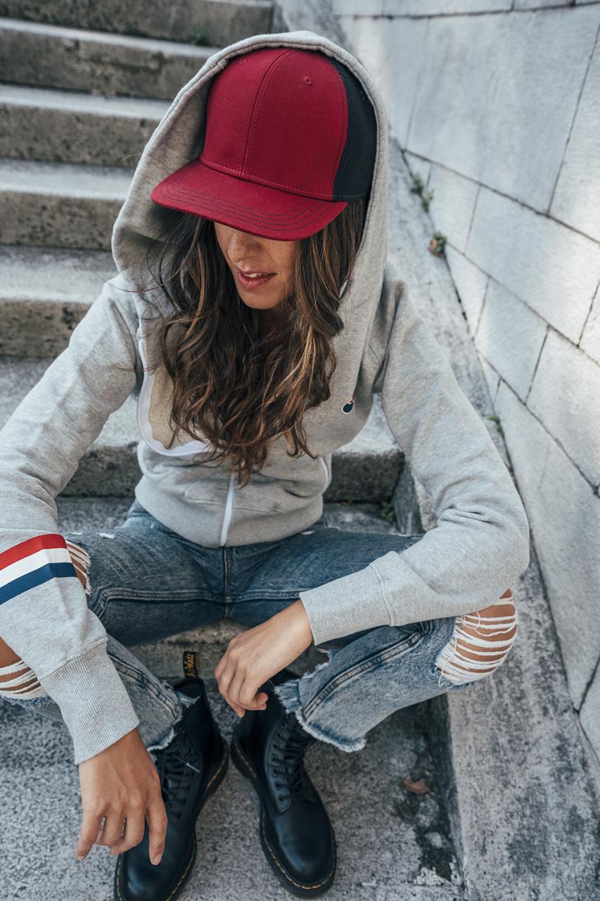 Trucker cap i tradisjonelt utseende med innovativ oppbygging. 6 paneler. Høy profil og lett buet brem. Polstret frontpanel. Kontrastsømmer. Svettebånd og mesh på sidepanel og bak. Tear away label. Regulerbar pvc-lukning (snap back). One size.