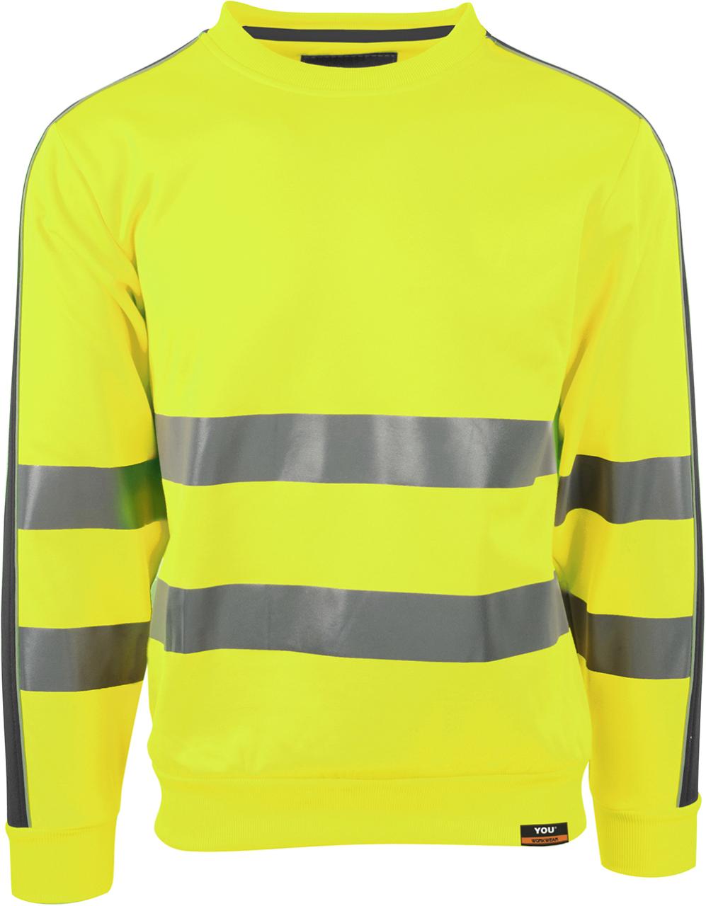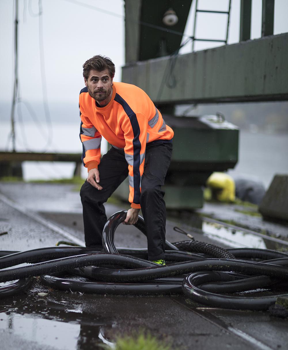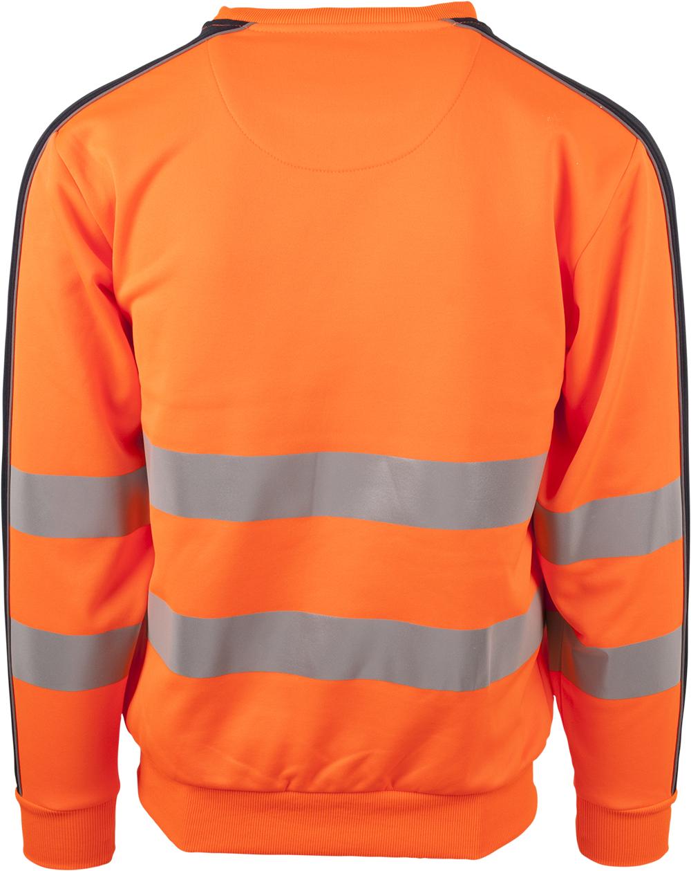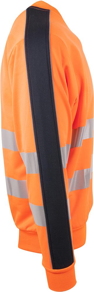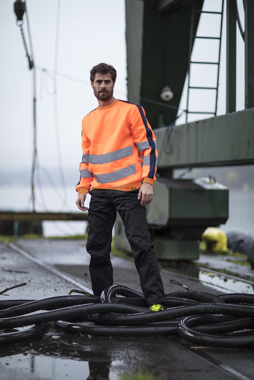 Tofarget unisex sweatshirt med kontrastfelt og elastisk refleks rundt midje og skuldre. Reflekspiping langs ermer. CE-merket. EN 20471, S - M: Klasse 2. L - 3XL: Klasse 3.