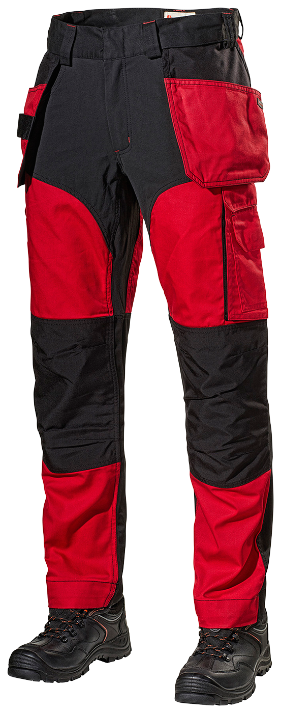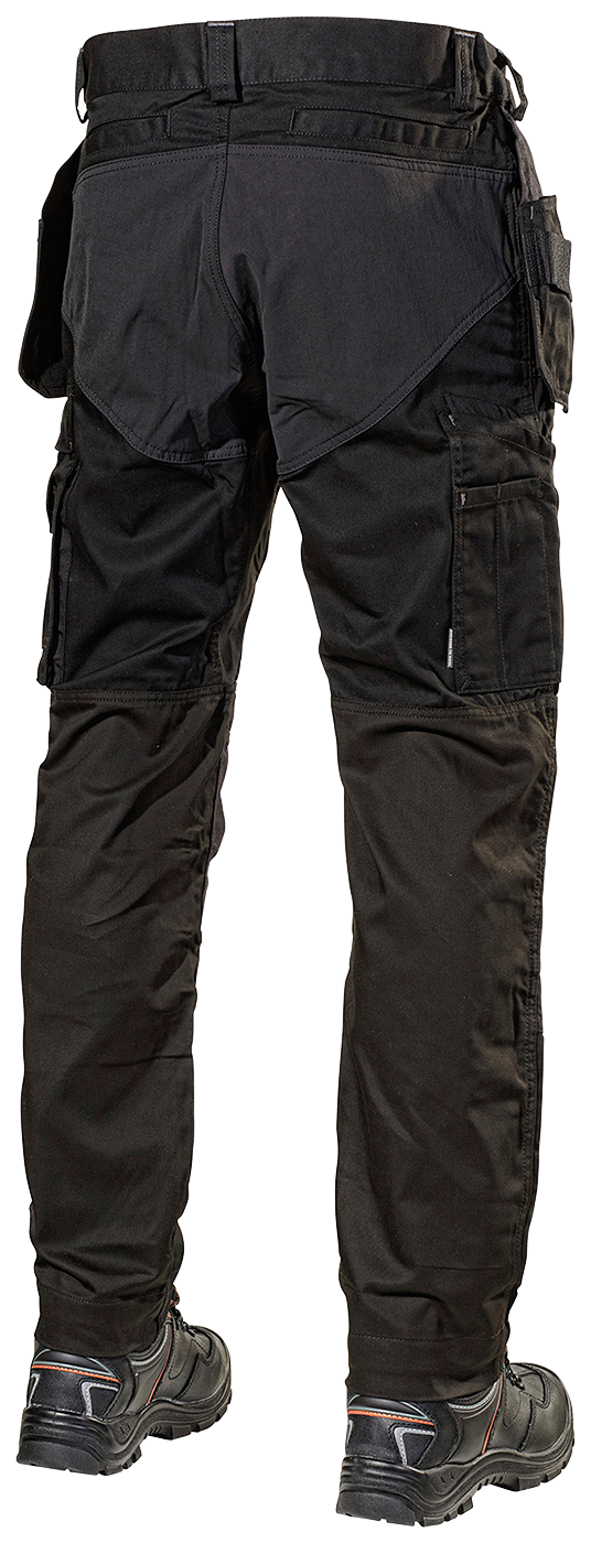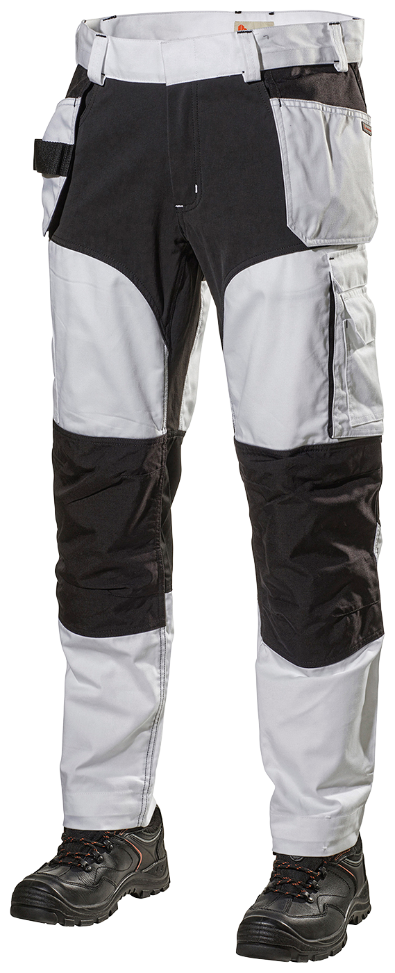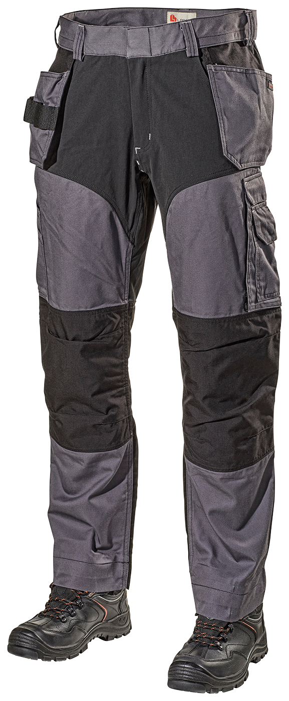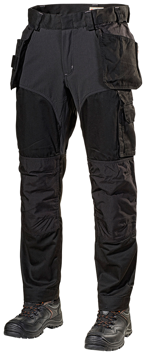 Bukse med to frontlommer, og innfelte stolpelommer bak som ivaretar bevegeligheten. Det er to avtagbare hengelommer med borrelås. Høyre benlomme har tommestokklomme med blyantholder, og en utvendig vinklet telefonlomme med magnetlås. Buksen har to innvendige knebeskyttelseslommer med to høydejusteringer.