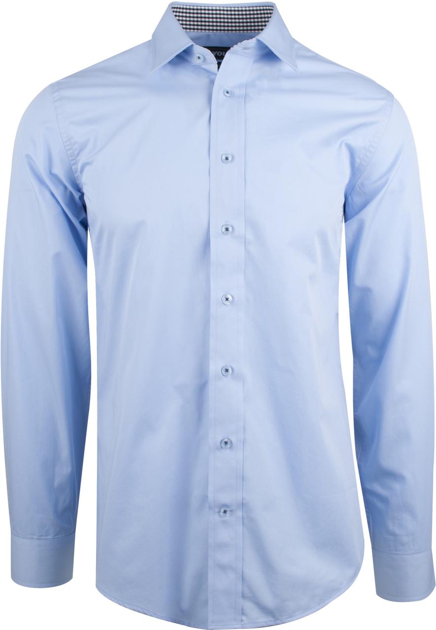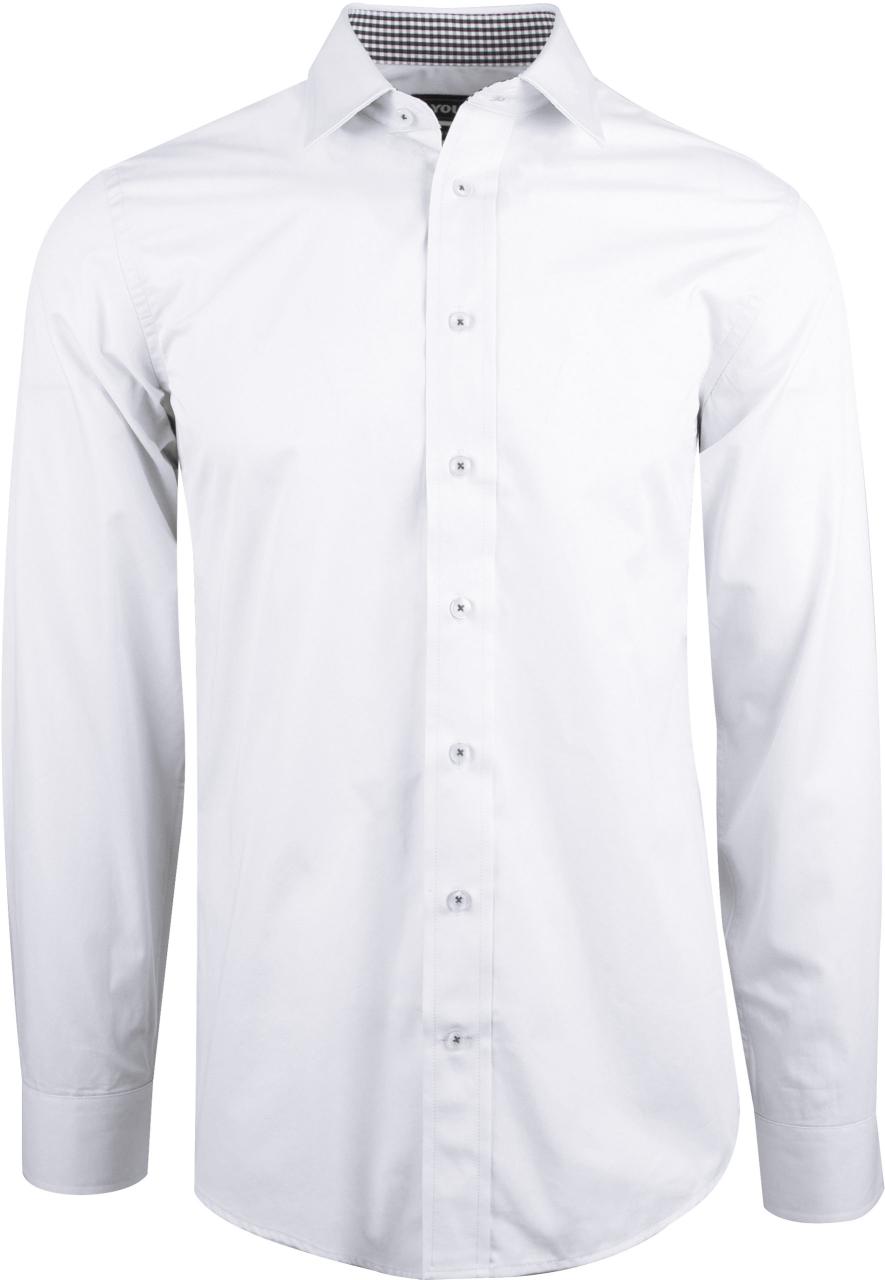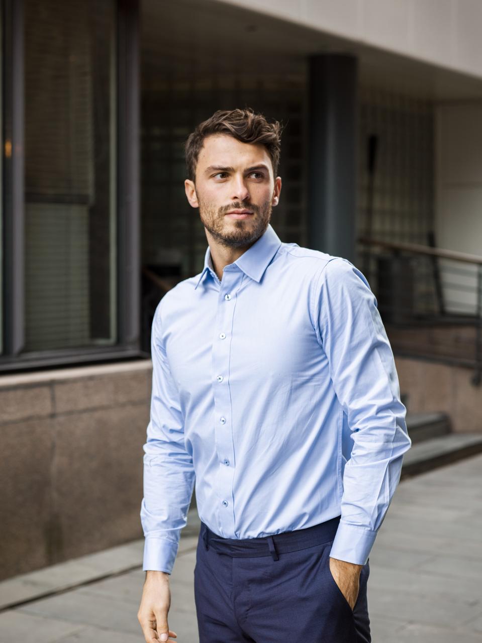 Figursydd business skjorte til herre. Uttagbar krageoppstiver. Innvendig kontrastfelt i krage og mansjetter. Strykelett og rask tørk.
