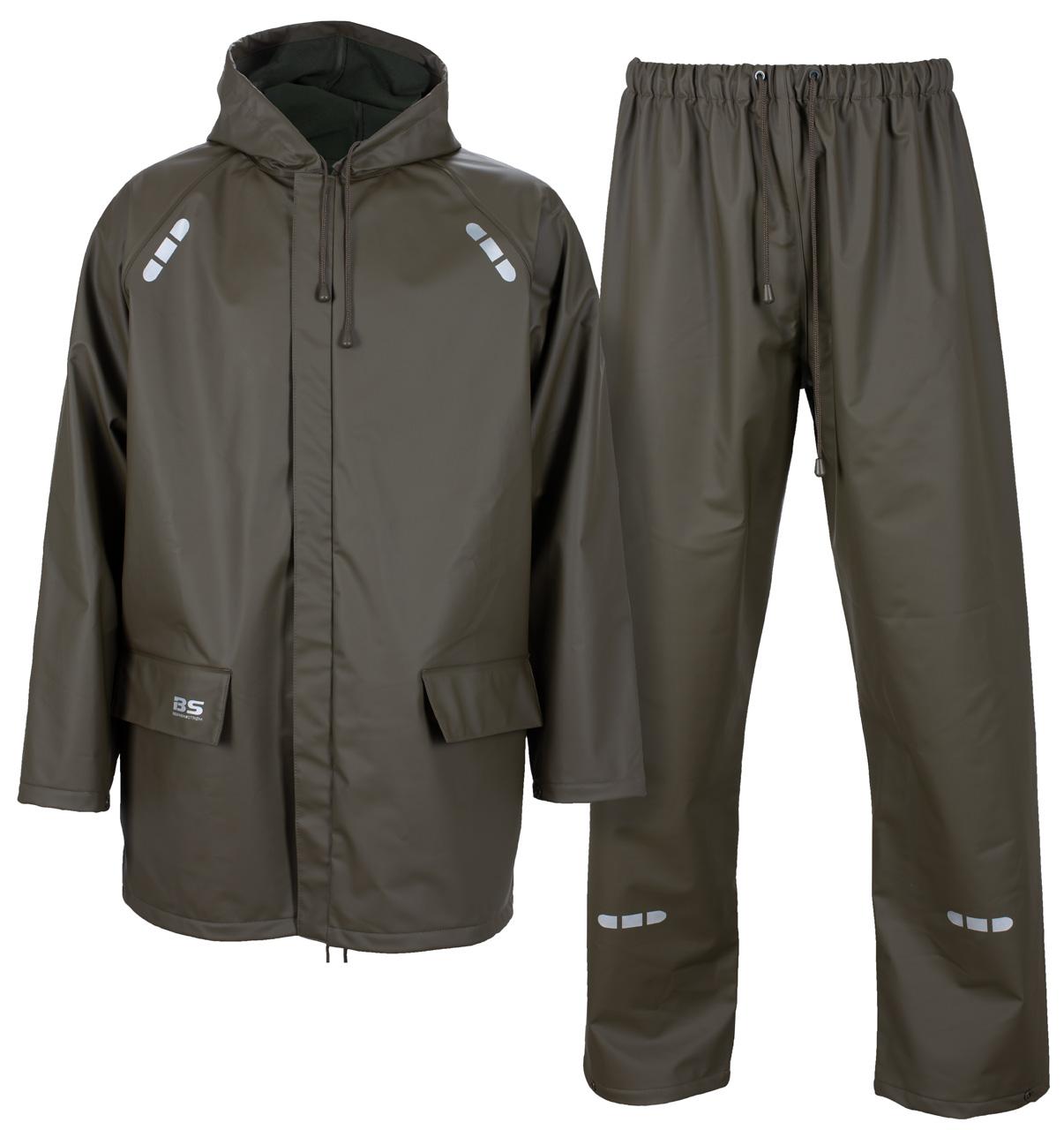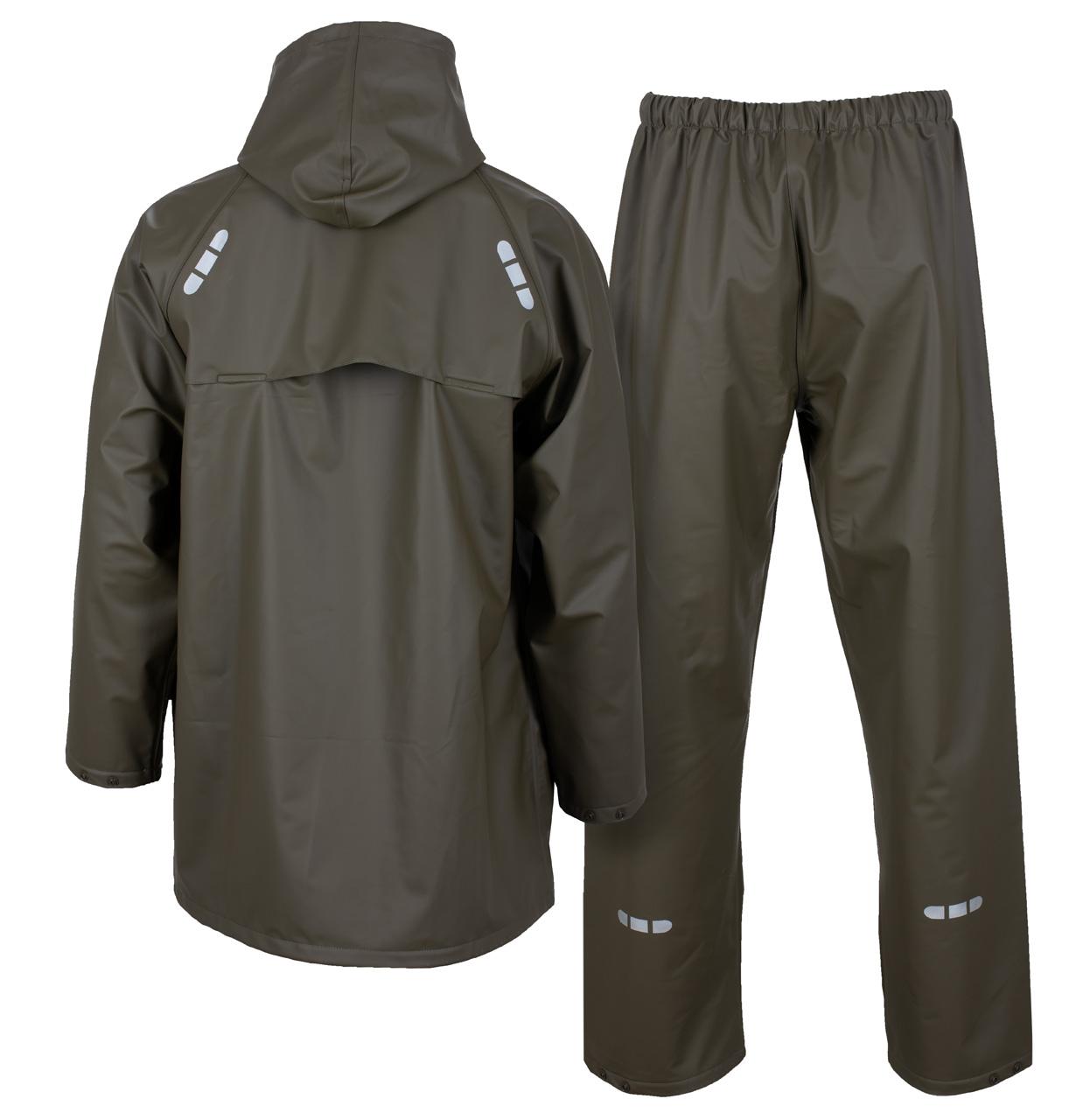 Et meget godt regntøysett i kraftig PU med flosset bakside som leveres med jakke med hette og sidelommer, klaff på rygg for luftsirkulasjon og glidelås med klaff i front, bukse med snor og strikk i liv. Refleksdetaljer foran og bak på skuldre og legger. Oeko-Tex. Vannsøyle >=20.000mm.