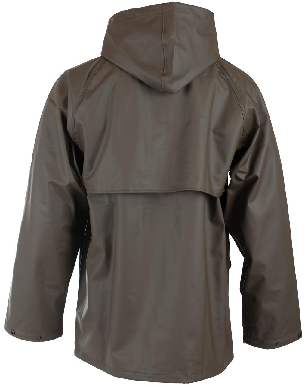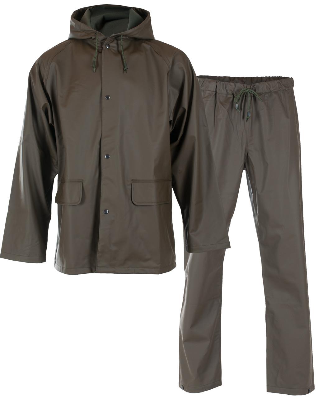 Et meget godt regntøysett i kraftig PU med flosset bakside som leveres med jakke med hette og sidelommer, klaff på rygg for luftsirkulasjon og glidelås med klaff i front, bukse med snor og strikk i liv. Øko-Tex. Vannsøyle 20.000mm.