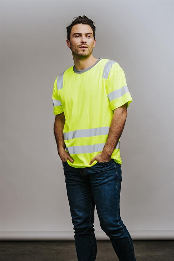 Unisex HI-VI t-skjorte i behagelig poly/cotton. Pustende utside og en myk bomullsinnside for en ekstra komfort. Kontrastfarget halsrib. Elastiske reflekser over skuldre, rundt ermer og midje. CE-merket EN 20471, klasse 2.