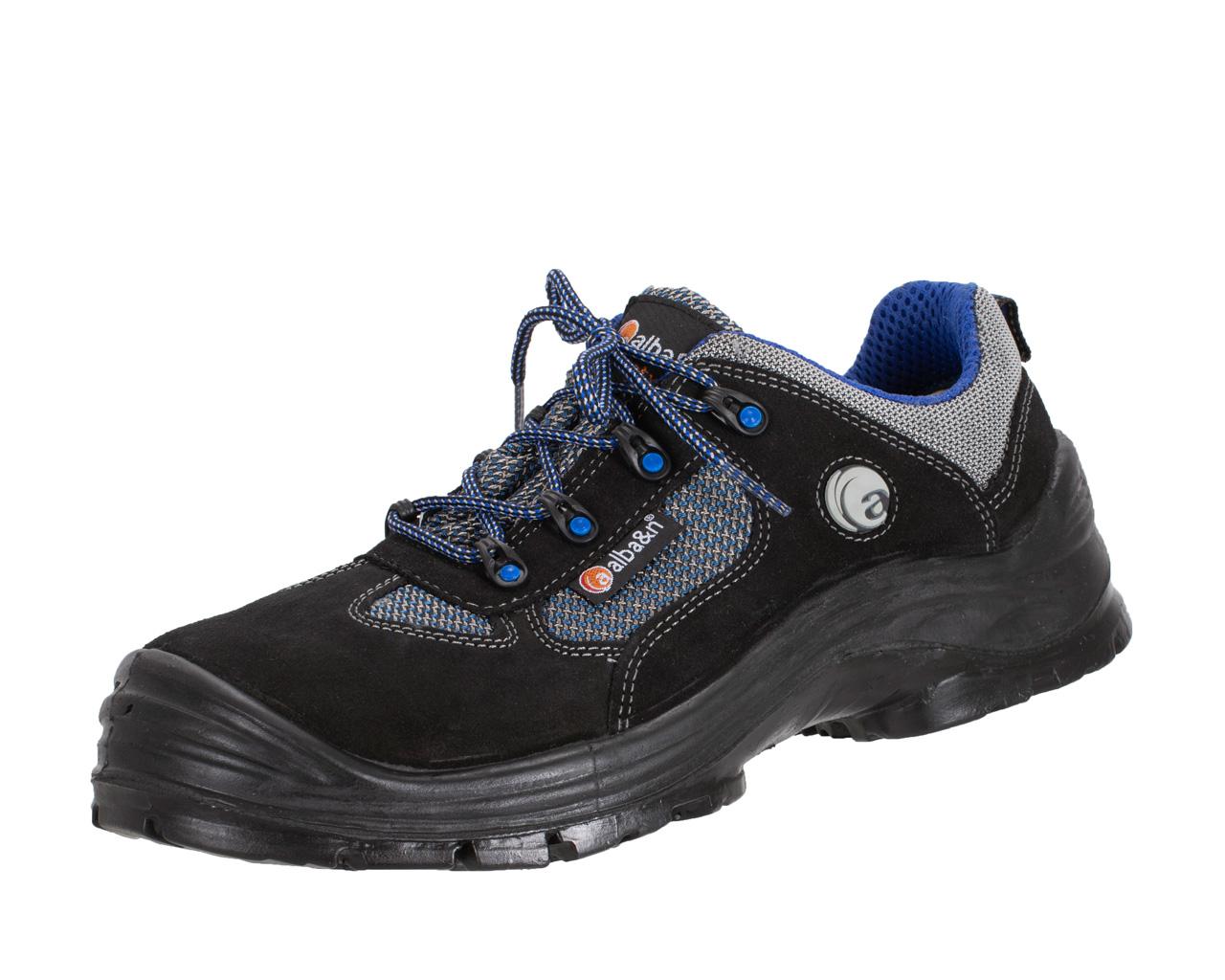Metallfri vernesko i sort semsket kvalitetslær og blå mønstret cordura. Anatomisk, antistatisk og fukttransporterende innersåle og fôr som gir ekstra god ventilasjon. Spikertrampsåle i kevlar og vernetå i kompositt. Energiabsorberende og ekstra myk yttersåle i PU og forsterket tåhette. Vekt pr. par i str. 42: 1210g. Farge: Sort med blå detaljer. EN 20345.