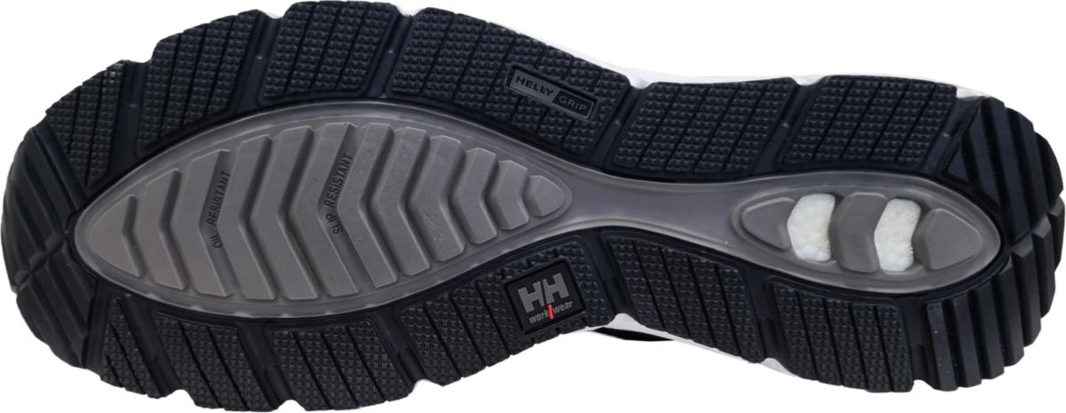 Støtdempende ETPU i hæl. Overdel i pustende mikrofiber. HellyGrip såle, tåvernhette og spikertrampsåle i kompositt. EN ISO 20345:2011 S3L ESD SRC.