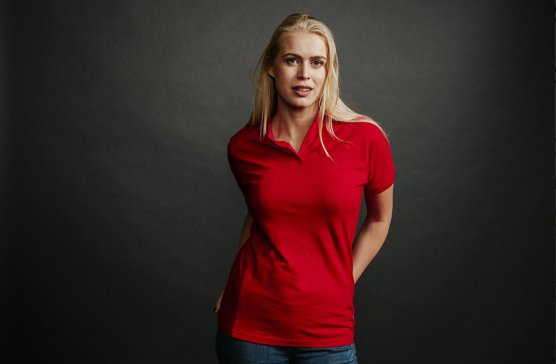 Klassisk polo til dame. Sidesplitt og ribdetaljer på krage og ermer. Dekorative flatlocksømmer rundt sidepanel. Matcher 3250 Milano og 3370 Carinda