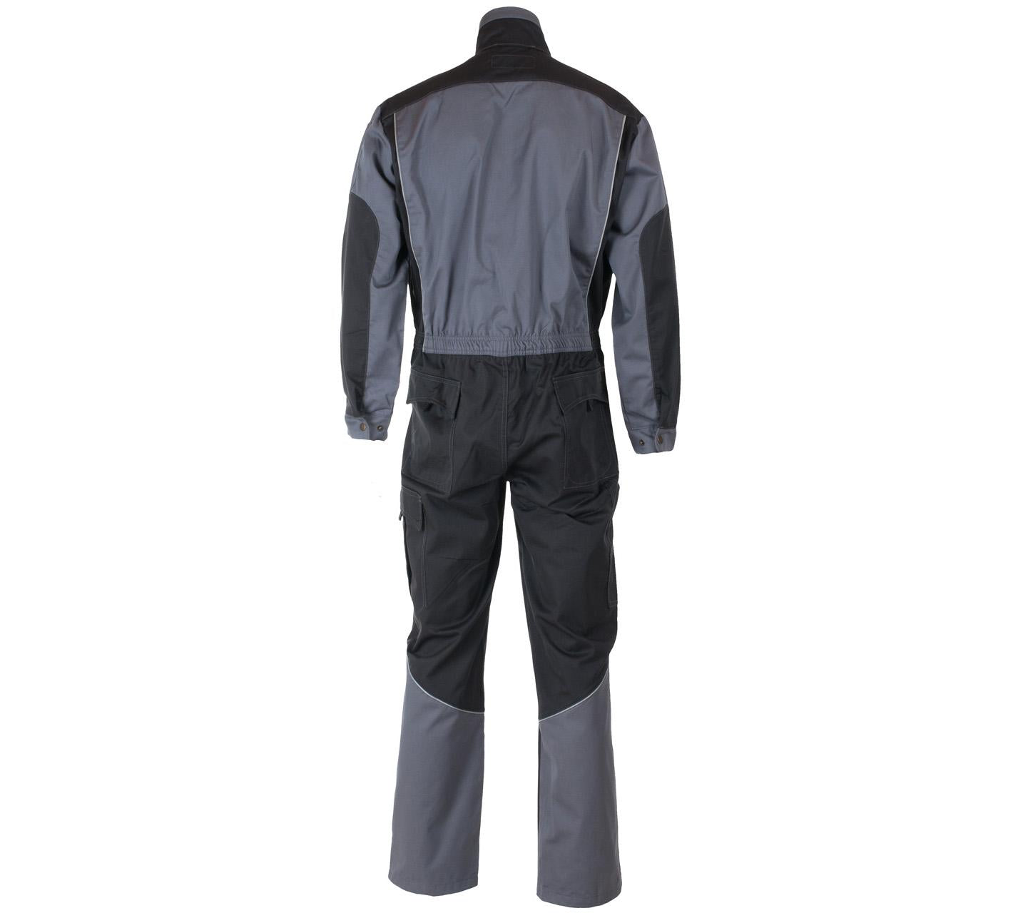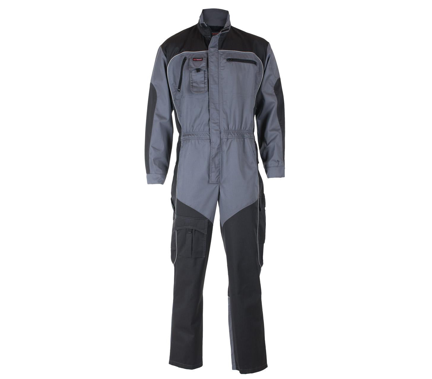 Kjeledress med strikk i liv, glidelås i front med klaff, gjennomgrep, stikklommer, tommestokklomme, brystlommer, to lårlommer og mobillomme.