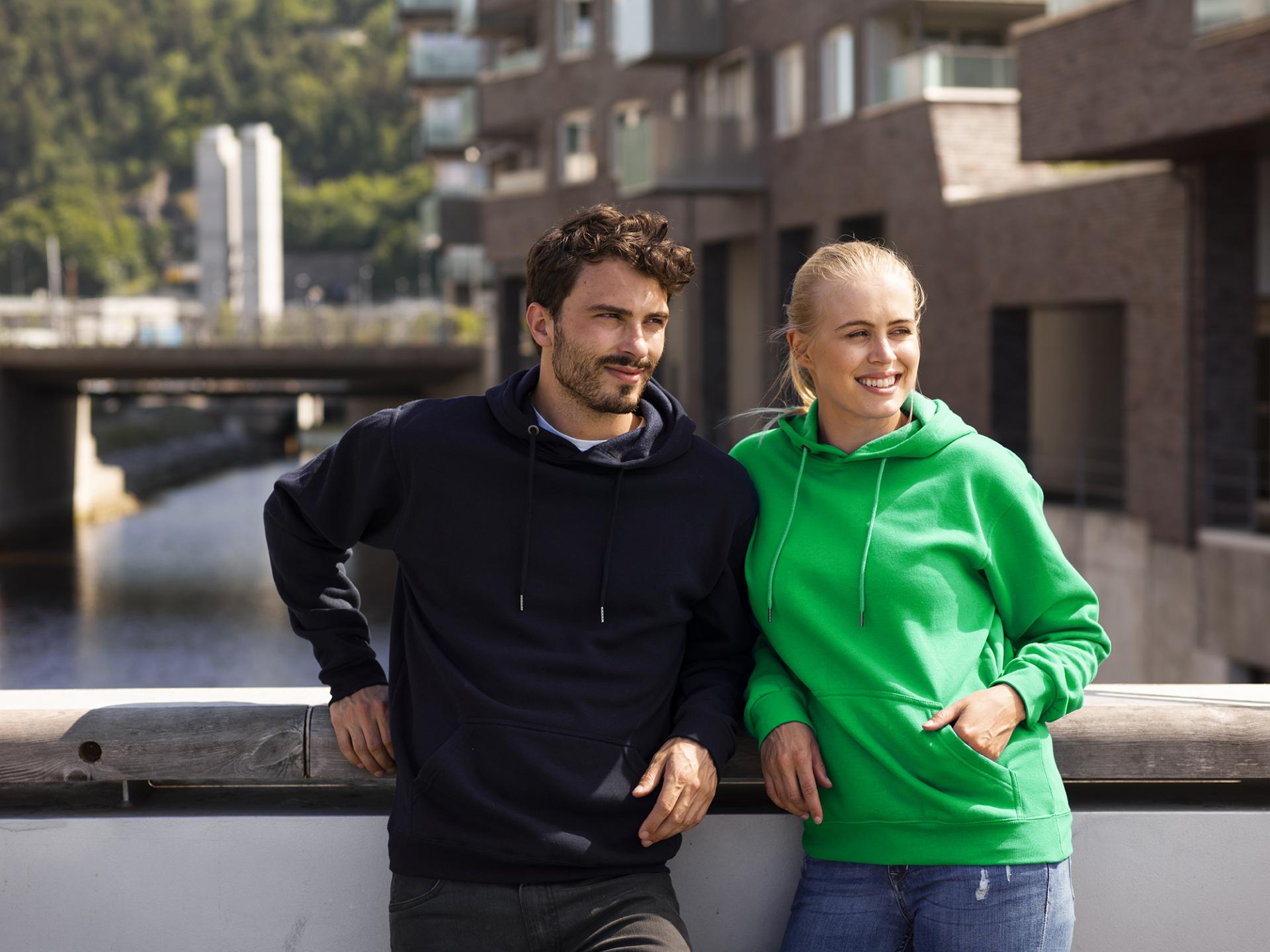 Klassisk unisex hettegenser med snøring og fôring i hette. Myk og god kvalitet med flosset innside og stikklomme i front. Lycra i alle ribber.