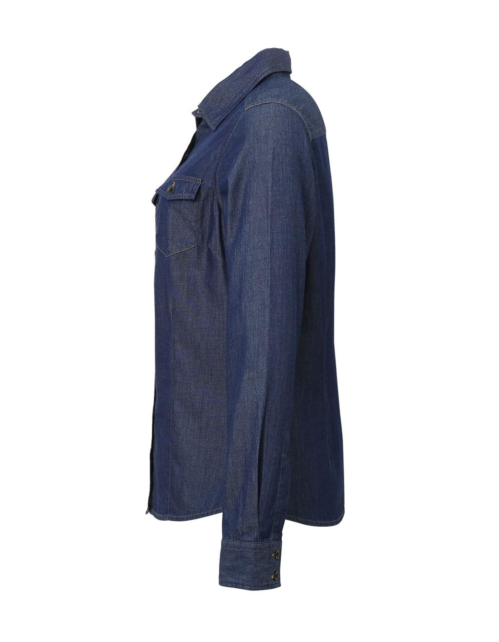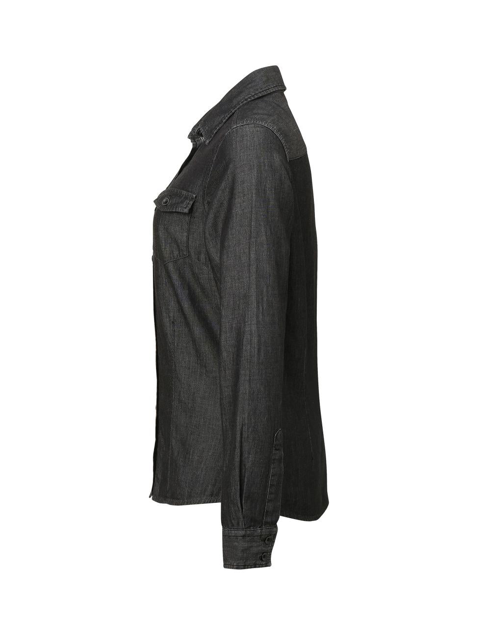 Myk og behagelig bomullsdenimskjorte til dame. Dekorative kontrastsømdetaljer over hovedsømmene. Myk krave og roll-back knapp på underarm for en opprullet og mer avslappet stil.