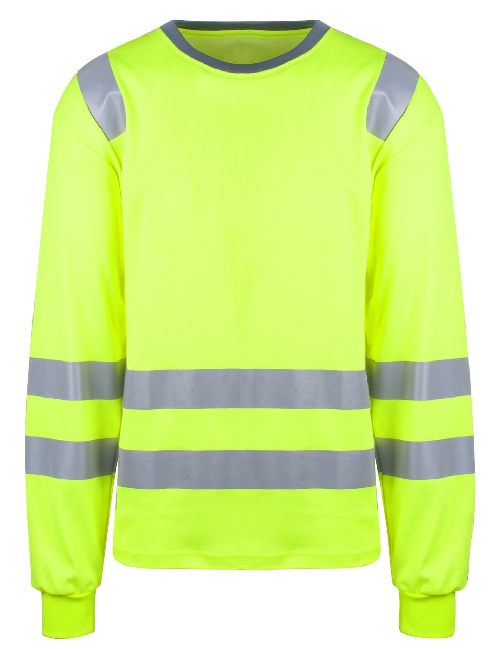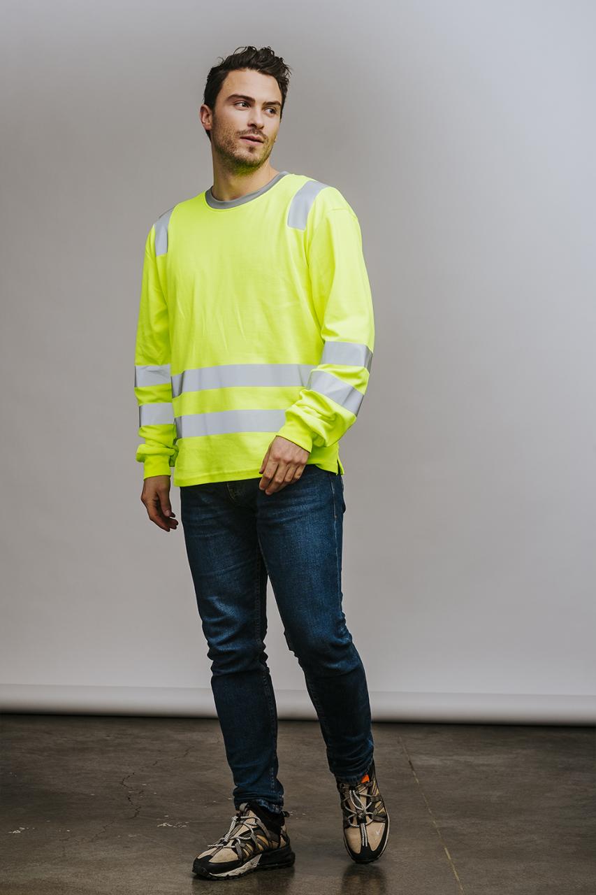 Unisex HI-VI langermet t-skjorte i behagelig poly/cotton. Pustende utside og en myk bomullsinnside for en ekstra komfort. Kontrastfarget halsrib. Elastiske reflekser over skuldre, rundt ermer og midje. Sidesplitt. CE-merket EN 20471. Klasse 2.